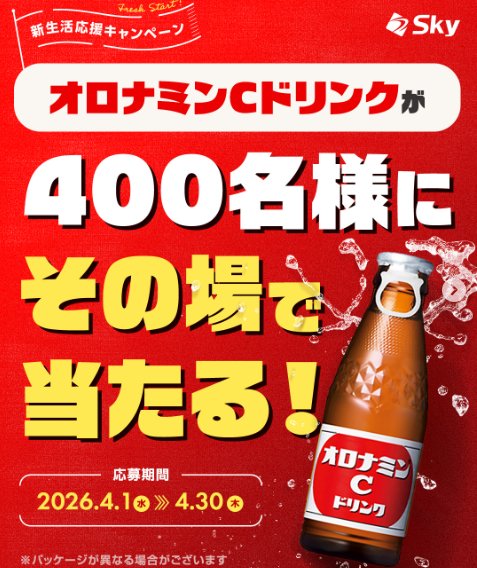 懸賞情報その場で当たるオロナミンCドリンクの引換券がその場で当たるInstagram懸賞 懸賞名:ICT業界就転職準備応援キャンペーン当選賞品:オロナミンCドリンク無料引換券当選人数:400名様応募条件:Instagramアカウントで応募企業名:Sky株式会社 この懸賞に応募する2026年04月30日(残り12日) 見逃せない懸賞QUOカードPay 最大1万円分合計10,000名様プリキュアグッズ9,000名様コズレオリジナルデザイン「出生届」メルマガ登録して必ずもらえるノンデネドリンクチケット10,000名様JTBトラベルギフト 5万円分 / ハンディクリーナー / カタログギフト 他各回5名様 / 各回20名様 / 各回30名様 他【無料体験可能】子ども向け「習い事・プログラミング教室」 応募可能な懸賞関連する当選報告 毎月開催!UCC商品が当たる会員限定プレゼントキャンペーン残り12日Wチャンスもアリ!3万円分のギフトカードが当たるクローズドキャンペーン毎月末日(応募数が200通を下回った場合はキャンペーン終了)ディズニーパークチケット+グルメチケットのセットが当たる豪華Xキャンペーン2026年04月28日(全4回開催)リンガーハットグループ食事券1,000円分が当たる毎日応募Xキャンペーン残り3日<JCB presents>Happiness with JCB!~ディズニー・オン・アイス招待券が当たるキャンペーン残り12日オリジナルグッズやデジタルポイントなどが当たる大量当選懸賞残り1日 トラストパークのキャンペーンで「小型掃除機」が当選しました!ヤマナカ×コーミのハガキ懸賞で「スイーツパラダイス バイキング券」が当選しました!揖保乃糸のハガキ懸賞で「Amazonギフト券 5,000円分」が当選しました☆西友×花王のキャンペーンで「花王商品詰め合わせ」が当選しました!KDDIのキャンペーンで「キッザニア無料招待券」が当選しました☆和光堂「出産祝いプレゼント」が当選しました♪ 関連情報: オープン懸賞LINE懸賞ネット懸賞その場で当たるInstagram懸賞無料クーポン・引換券SNS懸賞懸賞情報 ドリンク・飲料クーポン・無料券セブンイレブン HOME懸賞情報応募方法SNS懸賞LINE懸賞オロナミンCドリンクの引換券がその場で当たるInstagram懸賞 2026年04月06日 更新:ものりんず@懸賞主婦【厳選】毎日応募 【全て】毎日応募