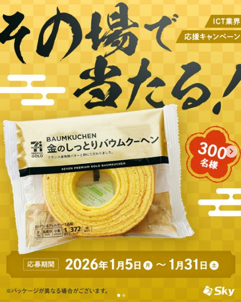 懸賞情報その場で当たるセブンプレミアムゴールド 金のしっとりバウムクーヘンの引換クーポンが当たるInstagramキャンペーン 懸賞名:ICT業界応援キャンペーン当選賞品:金のしっとりバウムクーヘン引換クーポン当選人数:300名様応募条件:Instagramアカウントで応募企業名:Sky株式会社 この懸賞に応募する2026年01月31日(残り8日) 見逃せない懸賞スノーギア、リフト券など合計1,260名様QUOカードPay 最大1万円分合計10,000名様月刊ポピーの無料おためし見本応募者全員えらべるPay 300円相当10,000名様コスメデコルテ 美白美容液サンプル10,000名様こどもちゃれんじ資料&年齢別体験セット応募者全員 応募可能な懸賞関連する当選報告 メーカー各社の人気おもちゃやこども商品券が100名様に当たる豪華懸賞残り8日夜用白玉タイトニングマスクがお試しできる商品モニターキャンペーン残り8日USJ ハロウィーン初日貸切招待券やスタジオ・パスも当たるJCBの豪華キャンペーン残り23日HOTEL 1899 TOKYO 宿泊券や招待券が当たるプレゼントキャンペーン残り4日キユーピー商品やオリジナルグッズが当たるポイントキャンペーン随時開催宿泊券や映画試写会なども当たるアンケート懸賞♪賞品によって異なります 永谷園のキャンペーンで「煮込みラーメン 秋冬メニュー詰め合わせ」が当選しました!おかしのまちおか・亀田製菓のハガキ懸賞で「おせんべい詰め合わせ」が当選しました!Nestle「ネスカフェ ゴールドブレンド バリスタTAMA」が当選しました☆むらせライス「むらせライスサポーター会員限定プレゼントキャンペーン」亀田製菓のTwitter懸賞で「マイハッピーターン無料クーポン」が当選しました!フィール&寿がきやのハガキ懸賞で「寿がきや謹製こだわりチャーシュー」が当選しました☆ 関連情報: オープン懸賞LINE懸賞ネット懸賞その場で当たるInstagram懸賞無料クーポン・引換券SNS懸賞懸賞情報 クーポン・無料券セブンイレブン HOME懸賞情報応募方法SNS懸賞LINE懸賞セブンプレミアムゴールド 金のしっとりバウムクーヘンの引換クーポンが当たるInstagramキャンペーン 2026年01月09日 更新:ものりんず@懸賞主婦【厳選】毎日応募 【全て】毎日応募 年末年始懸賞