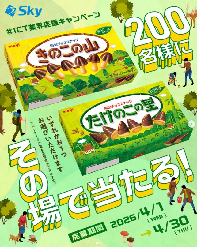 懸賞情報その場で当たる明治 きのこの山 or たけのこの里の引換クーポンが当たるInstagramキャンペーン 懸賞名:ICT業界応援キャンペーン当選賞品:きのこの山 or たけのこの里引換クーポン当選人数:200名様応募条件:Instagramアカウントで応募企業名:Sky株式会社 この懸賞に応募する2026年04月30日(残り6日) 見逃せない懸賞マミー UVジェル&UVミルク ミニサンプル5,000名様ガシャポンオンラインショップで使えるクーポン 最大1万円相当毎月最大1,105名様サンリオの幼児向け英語教材がお試しできる無料モニターキャンペーンプリキュアグッズ9,000名様QUOカード 1,000円分 / アスパラガスお菓子詰め合わせ / オリジナルボトル合計500名様 / 合計300名様 / 合計200名様JTBトラベルギフト 35,000円分毎月35名様 応募可能な懸賞関連する当選報告 毎月開催♪ジョンソン製品が当たるアンケートキャンペーン定期開催ポムポムプリンのオリジナルイラスト入りグッズセットが当たるキャンペーン残り38日毎月開催!花王製品が当たる、新規会員登録キャンペーン毎月開催アンパンマンのおもちゃが当たる、JR四国の列車スタンプラリーキャンペーン残り159日オッペン化粧品のコスメや家電、グルメが当たるキャンペーン!定期開催明治ブルガリアヨーグルトのオリジナルグッズや家電も当たる大量当選キャンペーン残り67日 ママこえ「コンビニスイーツに関するアンケートの当選謝礼」「SUNSTAR ファミリーミュージカル 2017」へ行ってきました♪島耕作 × グリコ「濃厚な日々に乾杯キャンペーン」ホクトのキャンペーンで「DOCTORAIR 3Dエアストレッチマット」が当選しました!エバラのキャンペーンで「ご当地牛12ヶ月分」が当選しました☆丸美屋「運気があがるお弁当レシピ&のっけるふりかけ」が当選しました! 関連情報: オープン懸賞LINE懸賞ネット懸賞その場で当たるInstagram懸賞イベント・エンタメ無料クーポン・引換券SNS懸賞遊園地・テーマパーク・イベント懸賞情報 クーポン・無料券セブンイレブン HOME懸賞情報応募方法SNS懸賞LINE懸賞明治 きのこの山 or たけのこの里の引換クーポンが当たるInstagramキャンペーン 2026年04月13日 更新:ものりんず@懸賞主婦【厳選】毎日応募 【全て】毎日応募