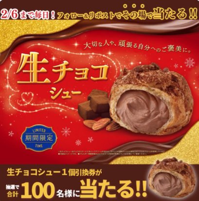 懸賞情報その場で当たる生チョコシューの無料引換券がその場で当たるキャンペーン 懸賞名:その場で当たるキャンペーン当選賞品:生チョコシュー無料引換券当選人数:100名様応募条件:X(Twitter)アカウントで毎日その場で当たる企業名:ビアードパパ この懸賞に応募する2026年02月06日(残り3日) 見逃せない懸賞ベビースターコンパクトホットプレート / ホシオくんドデカタオル各回45名様 / 各回130名様JCBギフトカード 30,000円分 / 菌活レトルトセット / 産直きのこセット毎月30名様 / 毎月200名様 / 毎月500名様入園無料招待券、グルメなど賞品によって異なりますPayPayポイント 最大10万円相当800万13名様コスメデコルテ 美白美容液サンプル10,000名様電動自転車 / ベビーラック / iRobot ルンバ ほか合計1,098名様 応募可能な懸賞関連する当選報告 オリジナルデザインQUOカードがその場で当たるクローズドキャンペーンキャンペーン告知パッケージがなくなり次第終了【サンドラッグ】最大1万円分のサンドラッグ専用QUOカードPayが当たるキャンペーン残り1日ヴァイオリニスト 﨑谷直人と、エレクトーン奏者 進士知雅による特別イベントが当たるキャンペーン(本日最終日!!)QUOカードPay1,000円分が1,000名様にその場で当たるレシートキャンペーン残り25日ペット用品やグルメも当たる豪華レシートキャンペーン残り25日毎日応募やその場で抽選もアリ☆dポイントが当たるキャンペーン♪定期開催 西友・LIVIN・サニー×サントリー×ロッテ×カルビー×フリトレーのハガキ懸賞で「ワイヤレスヘッドホン」が当選しました♪FamilyMartのハガキ懸賞で「アゲモン目覚まし時計」が当選しました♪マックスバリュ東海×メーカー各社の懸賞で「メーカー商品詰め合わせ」が当選しました!日本製粉のハガキ懸賞で「オーマーシリーズ 5品」が当選しました!第63回 学習図書まつり「スタディ・サポート・キャンペーン」DCM&東洋アルミ・3M・クレハのハガキ懸賞で「ギフトカード 5,000円分」が当選しました! 関連情報: X懸賞(Twitter懸賞)オープン懸賞毎日応募その場で当たるネット懸賞無料クーポン・引換券SNS懸賞懸賞情報 お菓子・スイーツ・デザートクーポン・無料券 HOME懸賞情報応募方法SNS懸賞X懸賞(Twitter懸賞)生チョコシューの無料引換券がその場で当たるキャンペーン 2026年02月02日 更新:ものりんず@懸賞主婦【厳選】毎日応募 【全て】毎日応募 年末年始懸賞