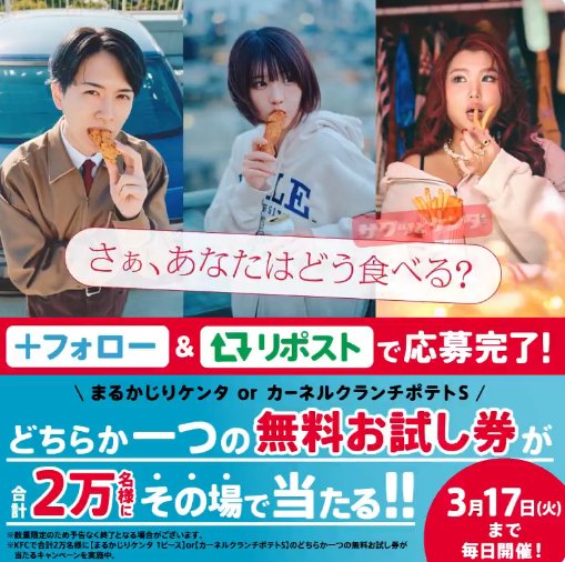 懸賞情報その場で当たるまるかじりケンタ1ピース or カーネルクランチポテト無料お試し券が当たる大量当選X懸賞 懸賞名:サクッとケンタ販売記念キャンペーン当選賞品:まるかじりケンタ1ピース or カーネルクランチポテト無料クーポン当選人数:2万名様応募条件:X(Twitter)アカウントで毎日その場で当たる企業名:ケンタッキーフライドチキン この懸賞に応募する(応募期間終了)2026年03月17日今すぐ応募可能な懸賞はコチラから 見逃せない懸賞Yunth ❘ Vのオリジナルステッカー / Yunth豪華セット1,000名様 / 100名様マルタイ商品詰め合わせ 5,000円相当1,000名様Disneyのおしりふき毎月1名様スノーギア、リフト券など合計1,260名様クルマ 1台 / ファミマ コーヒー無料引換クーポン / デジタルポイント毎月1名様 / 不明 / 不明妊婦さん必見!無料で試せる「紙おむつ・粉ミルク」のお得情報 BEST10♪ 応募可能な懸賞関連する当選報告 3,000円分のQUOカードPayが当たるクイズキャンペーン!毎週金曜日開催オリジナルモバイルバッテリーやデジタルギフトが当たるクローズドキャンペーン2026年04月30日(全2回抽選)アスタリフトのファンデ無料サンプルセットが全員お試しできる♪締切日不明全プレ☆万田酵素が無料でお試しできるお得なキャンペーン!締切日不明HERAの新製品がお試しできる商品モニター募集キャンペーン(本日最終日!!)ディズニーランド・1デーパスポート+パレード優先鑑賞席チケットも当たる豪華懸賞終了日未定 ママこえのキャンペーンで「Amazonギフト券1,000円分」が当選しました!ポチカム「すごくうるおう!SPF50+PA++++ オンリーミネラルのファンデーション」当選です♪ネスレのクローズド懸賞で「instax チェキ」が当選しました!KIRINのTwitter懸賞で「午後の紅茶 おいしい無糖 1ケース」が当選しました!バロー×雪印メグミルクのハガキ懸賞で「コードレス電動ブラシ」が当選しました!イオンクレジット「公共料金キャンペーン」 関連情報: X懸賞(Twitter懸賞)オープン懸賞毎日応募ネット懸賞その場で当たる大量当選無料クーポン・引換券SNS懸賞狙い目・穴場懸賞懸賞情報 クーポン・無料券ケンタッキー|KFC HOME懸賞情報応募方法SNS懸賞X懸賞(Twitter懸賞)まるかじりケンタ1ピース or カーネルクランチポテト無料お試し券が当たる大量当選X懸賞 2026年03月11日 更新:ものりんず@懸賞主婦【厳選】毎日応募 【全て】毎日応募