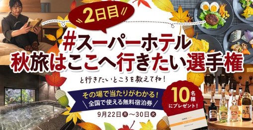 懸賞情報その場で当たるスーパーホテル宿泊券がその場で当たる豪華懸賞 懸賞名:秋だ!旅行に行こうキャンペーン当選賞品:スーパーホテル宿泊券当選人数:10名様応募条件:X(Twitter)アカウントで毎日その場で当たる企業名:スーパーホテル この懸賞に応募する(応募期間終了)2025年09月30日今すぐ応募可能な懸賞はコチラから 見逃せない懸賞オリジナルQUOカード 500円分 / えらべるPay 1,000ポイント300名様 / 700名様NOV[ノブ]シリーズ サンプルセット応募者全員こどもちゃれんじ資料&年齢別体験セット応募者全員国産ブランド牛肉 / 北海道産米合計1,000名様 / 1,000名様アルティミューン サンプル10,000名様母子手帳ケース / しかけ絵本 / Amazonギフト券 5,000円分 他応募者全員 / 応募者全員 / 毎月10名様 他 応募可能な懸賞関連する当選報告 栗原はるみさんトークショーやペアマグセットが当たる雪印メグミルクのクローズド懸賞残り22日HYPER ZONe / HYPER ZONe ZERO1ケースが当たるクローズドキャンペーン残り55日BRUNOの天ぷら鍋やおこめギフト券が当たるニップンのクローズドキャンペーン残り55日その場でdポイントが当たる毎日くじキャンペーン♪締切日不明からしマヨボトルがその場で当たる明星食品の大量当選キャンペーン残り55日合計10万名様にお菓子BOXやエコバッグが当たるカルビー大収穫祭キャンペーン2025年12月08日(全10回抽選) ダイショーのハガキ懸賞で「オリジナルもつ鍋セット」が当選しました☆立川ブラインド工業「タチカワ Chance Choice キャンペーン」KIRIN「星のカービィ ロボボプラネット」が当選しました♪DCM&花王のハガキ懸賞で「アタックNeo抗菌EX Wパワー」が当選しました☆ヨシヅヤ・ロッテの懸賞で「劇場版 ポケットモンスター 特別前売券」が当選しました!Yストア&メイトーのハガキ懸賞で「野球観戦チケット」が当選しました! 関連情報: X懸賞(Twitter懸賞)オープン懸賞旅行・宿泊毎日応募その場で当たるネット懸賞豪華・高額懸賞SNS懸賞懸賞情報 ホテル・旅館宿泊券・旅行券 HOME懸賞情報応募方法SNS懸賞X懸賞(Twitter懸賞)スーパーホテル宿泊券がその場で当たる豪華懸賞 2025年09月24日 更新:ものりんず@懸賞主婦【厳選】毎日応募 【全て】毎日応募