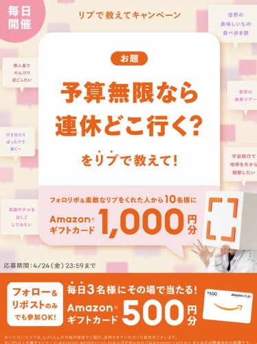 懸賞情報その場で当たる毎日3名様にAmazonギフトカードがその場で当たるXキャンペーン 懸賞名:フォロー&リポストキャンペーン当選賞品:Amazonギフトカード 500円分当選人数:毎日3名様応募条件:X(Twitter)アカウントで毎日その場で当たる企業名:LIFULL この懸賞に応募する(応募期間終了)2026年04月24日今すぐ応募可能な懸賞はコチラから 見逃せない懸賞真空断熱ケータイマグ1,000名様えらべるPay 200ポイント10,000名様デジタルギフトカード 最大1万円分936名様星野リゾート宿泊券 50,000円分 / PlayStation 5 / カタログギフト 他20名様 / 20名様 / 毎月20名様 他Coke ONポイント 10万円分 / Coke ONスタンプ10名様 / 99,990名様オリジナル名入れ絵本ダウンロードデータ対象者全員 応募可能な懸賞関連する当選報告 【バースデイ×雪印】最大1万円分のしまむらグループ商品券が当たるキャンペーン残り10日知育おもちゃ・メイキングトイが当たるプレゼントキャンペーン♪随時開催1,000名様にその場でPontaポイントが当たる大量当選Xキャンペーン残り10日セブンプレミアム カフェラテの無料引換クーポンが当たるXキャンペーン(本日最終日!!)Wチャンスもアリ!沖縄ペア宿泊券や豪華家電も当たるクローズドキャンペーン残り31日20名様にアンパンマンのおもちゃが当たるアンケートキャンペーン残り8日 コノミヤのクローズド懸賞で「文楽親子劇場チケット」が当選しました!小田急百貨店「MAISON TROISGROS フルーツドリンク」が当選しました☆ミューズ「キッチンミューズ 本体」が当選しました♪Suntory「トクホ ボスグリーン 6缶」が当選しました♪日本ハムのクローズド懸賞で「福俵 大黒+中華名菜」が当選しました!「SUNSTAR ファミリーミュージカル 2016」が当選しました! 関連情報: X懸賞(Twitter懸賞)オープン懸賞毎日応募その場で当たるネット懸賞現金・金券・ギフト券SNS懸賞懸賞情報 Amazonギフト券商品券・ギフト券・金券 HOME懸賞情報応募方法SNS懸賞X懸賞(Twitter懸賞)毎日3名様にAmazonギフトカードがその場で当たるXキャンペーン 2026年04月20日 更新:ものりんず@懸賞主婦【厳選】毎日応募 【全て】毎日応募