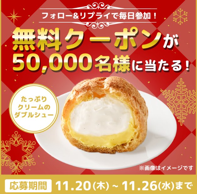 懸賞情報その場で当たるたっぷりクリームのダブルシューの無料クーポンが当たる大量当選X懸賞 懸賞名:たっぷりクリームのダブルシューの無料クーポンがあたるキャンペーン当選賞品:ダブルシュー無料クーポン当選人数:50,000名様応募条件:X(Twitter)アカウントで毎日その場で当たる企業名:ファミリーマート この懸賞に応募する2025年11月26日(残り6日) 見逃せない懸賞PayPayポイント 最大400円分1,960名様新車購入時に使える購入支援 最大30万円合計4,700名様Amazonギフト券 10,000円分 / ジェラートピケ ママバッグ3名様 / 1名様Amazonギフトカード 500円分2,000名様エイトフォーパテ無料サンプル対象者全員入園無料招待券、グルメなど賞品によって異なります 応募可能な懸賞関連する当選報告 毎月開催♪ニチレイ商品の詰め合わせが当たるキャンペーン毎月応募可能家庭学習教材 月刊ポピーの無料おためし見本プレゼント!常時募集中!貝印のminessシリーズがお試しできる商品モニター募集キャンペーン残り10日毎月抽選!リポビタンやQUOカードが当たるクローズドキャンペーン2026年03月31日(全7回開催)最大16,000ディズニーポイントがもらえるオンライン新規入会キャンペーン残り131日毎月応募OK!サンスター製品が当たる会員限定キャンペーン♪毎月末日 「キッザニア招待券」が日世のキャンペーンで当選しました!ニッスイ「みんなのしあわせごはん オープニングキャンペーン」おかしのまちおか×カバヤ食品のハガキ懸賞で「旬のフルーツBOX」が当選しました♪ニチバンのハガキ懸賞で「フレンチカップケーキ」が当選しました☆カゴメのLINE懸賞で「カゴメ健康飲料セット」が当選しました♪@cosme「POLA RED B.A ローション」 関連情報: X懸賞(Twitter懸賞)オープン懸賞毎日応募ネット懸賞その場で当たる大量当選無料クーポン・引換券SNS懸賞狙い目・穴場懸賞懸賞情報 クーポン・無料券ファミリーマート HOME懸賞情報応募方法SNS懸賞X懸賞(Twitter懸賞)たっぷりクリームのダブルシューの無料クーポンが当たる大量当選X懸賞 2025年11月20日 更新:ものりんず@懸賞主婦【厳選】毎日応募 【全て】毎日応募 クリスマス懸賞 年末年始懸賞