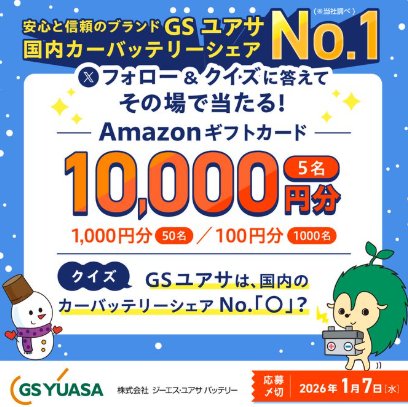 懸賞情報その場で当たる最大10,000円分のAmazonギフトカードがその場で当たる豪華X懸賞 懸賞名:フォロー&引用リポストキャンペーン当選賞品:Amazonギフトカード 最大10,000円分当選人数:1,055名様応募条件:X(Twitter)アカウントで毎日その場で当たる企業名:ジーエス・ユアサ バッテリー この懸賞に応募する(応募期間終了)2026年01月07日今すぐ応募可能な懸賞はコチラから 見逃せない懸賞JCBギフトカード 5,000円分1,000名様ディズニーシー パークチケット対象者全員入園無料招待券、グルメなど賞品によって異なりますプレミアムポイント 最大10,000ポイント毎月80,101名様『生梅飴』の”なか”合計1,500名様Panasonic 電気圧力鍋 / Nintendo Switch / LOGOS ポップフルシェルター 他1名様 / 1名様 / 1名様 他 応募可能な懸賞関連する当選報告 ガリガリ君のオリジナルグッズなどが当たるクローズド懸賞☆随時開催知育おもちゃ・メイキングトイが当たるプレゼントキャンペーン♪随時開催カタログギフトや豪華グルメなどが当たるInstagramフォトコンキャンペーン残り7日【無料体験可能】子ども向け「習い事・プログラミング教室」残り355706日すっきり収納できるキャリーボックスがお試しできる商品モニターキャンペーン残り27日図書カードネットギフト1,000円分が当たる、春の女性誌キャンペーン残り50日 アピタ・ピアゴ&桃屋のハガキ懸賞で「桃屋瓶詰め3本セット」が当選しました!カリフォルニア くるみ協会「くるみ大収穫祭」東洋水産のハガキ懸賞で「どこでも洗濯セット」が当選しました!JAタウンのTwitter懸賞で「黒毛和牛ロースステーキ」が当選しました!フィール・カゴメ・キユーピーのハガキ懸賞で「カゴメ・キユーピー詰め合わせ」が当選しました☆オークワ・S&Bのハガキ懸賞で「ラ・ベットラ ティラミスセット」が当選しました♪ 関連情報: X懸賞(Twitter懸賞)オープン懸賞毎日応募その場で当たるネット懸賞豪華・高額懸賞現金・金券・ギフト券大量当選SNS懸賞懸賞情報 高額賞品・高級品Amazonギフト券商品券・ギフト券・金券 HOME懸賞情報応募方法SNS懸賞X懸賞(Twitter懸賞)最大10,000円分のAmazonギフトカードがその場で当たる豪華X懸賞 2025年12月23日 更新:ものりんず@懸賞主婦【厳選】毎日応募 【全て】毎日応募 年末年始懸賞