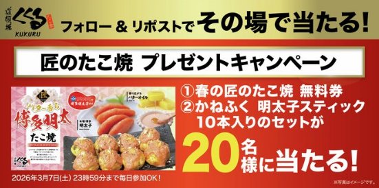 懸賞情報その場で当たるたこ焼き無料クーポンなどがその場で当たるXキャンペーン 懸賞名:くくる × SABAR コラボキャンペーン当選賞品:たこ焼き無料クーポン & かねふく明太子スティック当選人数:20名様応募条件:X(Twitter)アカウントで毎日その場で当たる企業名:たこ家道頓堀くくる この懸賞に応募する(応募期間終了)2026年03月07日今すぐ応募可能な懸賞はコチラから 見逃せない懸賞グ~ン おむつサンプル毎月10,000名様味の素商品やオリジナルグッズなど賞品によって異なりますベビーカー / 抱っこ紐 / ベビーベッド / Amazonギフト 10,000円分 他1名様 / 1名様 / 1名様 / 3名様 他PayPayポイント 300円分1,000名様EDWIN 特製ブルーGジャン / デニムバッグ / デニムコースター+一番搾り 糖質ゼロ100名様 / 500名様 / 1,000名様タカラcanチューハイ 1ケース毎月5名様 応募可能な懸賞関連する当選報告 マルちゃん商品詰め合わせが当たる東洋水産の投票キャンペーン残り1日ディズニーデザインのオリジナルICカードステッカーが当たるキャンペーン残り62日丸大食品のロングセラー商品セットがその場で当たるTwitterキャンペーン!応募期限終了世界で一つだけのオリジナル名入れ絵本を作れる会員登録キャンペーン常時募集中10,000円分のこども商品券が当たるタカラトミーのクローズドキャンペーン残り69日最大16,000ディズニーポイントがもらえるオンライン新規入会キャンペーン残り1日 KIRIN「選べる一番搾り12本セット」が当選しました☆揖保乃糸のハガキ懸賞で「Amazonギフト券 5,000円分」が当選しました☆エスビー食品「ゴールデンカレー黄金の香り実感! 食べ比べセット」が当選しました♪ケンユーのクローズド懸賞で「現金 1万円」が当選しました!「東京2020オリンピック」観戦チケットが当選しました☆奇跡のオリ・パラW懸賞当選西友×明治のハガキ懸賞で「Coleman ファイアーディスク ソロ」が当選しました! 関連情報: X懸賞(Twitter懸賞)オープン懸賞毎日応募その場で当たるネット懸賞無料クーポン・引換券SNS懸賞食品・飲料懸賞情報 食品・グルメ詰め合わせ・セットクーポン・無料券 HOME懸賞情報応募方法SNS懸賞X懸賞(Twitter懸賞)たこ焼き無料クーポンなどがその場で当たるXキャンペーン 2026年03月02日 更新:ものりんず@懸賞主婦【厳選】毎日応募 【全て】毎日応募