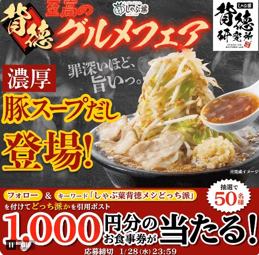 懸賞情報その場で当たるしゃぶ葉の1,000円分食事券がその場で当たるXキャンペーン 懸賞名:抽選で50名様に1,000円分のお食事券が当たる!当選賞品:しゃぶ葉食事券 1,000円分当選人数:50名様応募条件:X(Twitter)アカウントで毎日その場で当たる企業名:しゃぶ葉 この懸賞に応募する2026年01月28日(残り5日) 見逃せない懸賞パンダちゃん抱きまくら3,000名様旅行券 10万円分 / 最大1,000Pontaポイント1名様 / 1,000名様JTB カタログギフト1名様デジタルポイント 最大16,000ポイント1,330名様PayPayポイント 1,000ポイント1,000名様月刊ポピーの無料おためし見本応募者全員 応募可能な懸賞関連する当選報告 アマギフやHMV&BOOKS online 限定クーポンなどが当たるローチケ購入キャンペーン残り19日BRUNOコンパクトホットプレートやカタログギフトも当たるタカノフーズのレシート懸賞2026年01月31日(全2回開催)毎月開催!JA香川県の農産物などが当たるクイズキャンペーン定期開催その場で抽選!PayPayポイント1,000ポイントが当たるキャンペーン残り8日QUOカードや豪華賞品が当たるけいりんマルシェのキャンペーン♪随時開催子どもにピッタリの教材が見つかる!幼児向け教材をまとめました♪残り355723日 P&G「myレシピ.com『オトナのコミュニティ オトナの知恵の輪』」ソフトバンクのキャンペーンで「リッチモンドホテル宿泊優待券10,000円分」が当選しました!ROSETTE「2016年春夏新商品 ロゼット洗顔パスタ ホワイトダイヤ モニター」イトーヨーカドー×キリンのハガキ懸賞で「商品券 1,000円分」が当選しました☆味の素のハガキ懸賞で「ドリッパー+クリーマー」が当選しました♪イオンクレジット「公共料金キャンペーン」 関連情報: X懸賞(Twitter懸賞)オープン懸賞毎日応募ネット懸賞その場で当たる現金・金券・ギフト券SNS懸賞懸賞情報 食事券・グルメ券 HOME懸賞情報応募方法SNS懸賞X懸賞(Twitter懸賞)しゃぶ葉の1,000円分食事券がその場で当たるXキャンペーン 2026年01月23日 更新:ものりんず@懸賞主婦【厳選】毎日応募 【全て】毎日応募 年末年始懸賞