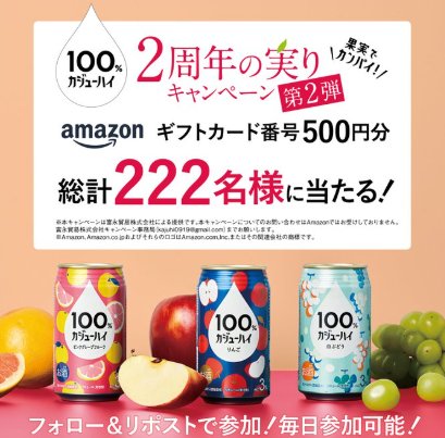 懸賞情報 Amazonギフトカード500円分が222名様に当たる毎日応募Xキャンペーン 懸賞名:2周年の実りキャンペーン当選賞品:Amazonギフトカード 500円分当選人数:222名様応募条件:X(Twitter)アカウントで毎日応募企業名:100%カジューハイ この懸賞に応募する(応募期間終了)2025年10月15日今すぐ応募可能な懸賞はコチラから 見逃せない懸賞 まみれさん危機一発3,000名様シャープ プラズマクラスター ドレープフロードライヤー / バルミューダ バルミューダ ザ・トースター / Meta Quest 3S 128GB / デジタルギフト各回50名様 / 各回50名様 / 各回50名様 / 100,000名様妊婦さん必見!無料で試せる「紙おむつ・粉ミルク」のお得情報 BEST10♪JCBギフトカード 3,000円分 / 朝のフレッシュ詰め合わせ1,000名様 / 100名様Coke ONドリンクチケット / PayPayポイント 500ポイント / BALMUDA ReBaker 他100,000名様 / 10,000名様 / 50名様 他無料で試せる「ベビー用スキンケア」のお得情報♪ 応募可能な懸賞 関連する当選報告 チェーンWチャンスもアリ!こだわりでんタコセットが1,000名様に当たるキャンペーン残り24日キユーピーオリジナル商品が当たる毎日応募クイズキャンペーン残り4日その場で応援カメすけが当たるグリコのクローズドキャンペーン残り38日ディズニーシー25周年“スパークリング・ジュビリー”スペシャルナイト招待券が当たるキャンペーン残り9日東京ドームシティ アトラクションズのワンデーパスも当たる豪華アプリ懸賞残り10日Glicoのおいしい塩分量シリーズセットやBRUNOマルチ圧力クッカーが当たるキャンペーン2026年01月31日(全2回開催) イオンのTwitter懸賞で「イオンギフトカード 5,000円分」が当選しました☆LIONのキャンペーンで「ソフラン 4本セット」が当選しました♪第2広報室「ラ ロッシュ ポゼのUVイデア XL プロテクションBB」モニターに当選しました!マックスバリュ東海×おやつカンパニーのハガキ懸賞で「おやつタウンパスポート」が当選しました!講談社のハガキ懸賞で「スパイダーマン ムビチケ」が当選しました☆Coca-Cola【発売前に緊急ミッション!『ジョージア ザ・プレミアム 微糖』が発売前に当たる!】キャンペーン 関連情報: X懸賞(Twitter懸賞)オープン懸賞毎日応募ネット懸賞現金・金券・ギフト券SNS懸賞懸賞情報 Amazonギフト券商品券・ギフト券・金券 HOME懸賞情報応募方法SNS懸賞X懸賞(Twitter懸賞)Amazonギフトカード500円分が222名様に当たる毎日応募Xキャンペーン 2025年10月01日 更新:ものりんず@懸賞主婦 【厳選】毎日応募 【全て】毎日応募 クリスマス懸賞 年末年始懸賞
