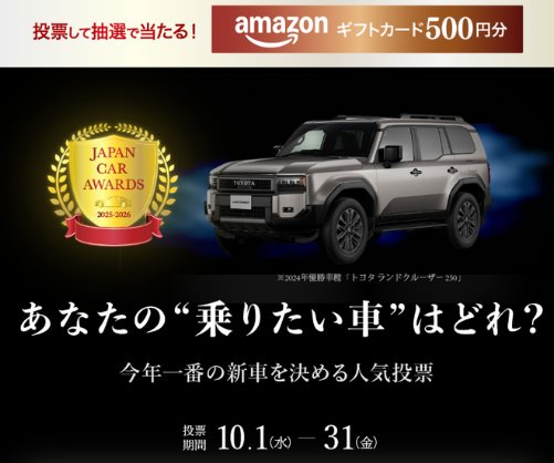 懸賞情報毎日3名様にAmazonギフトカード500円分が当たるX投票キャンペーン 懸賞名:JAPAN CAR AWARDS当選賞品:Amazonギフトカード 500円分当選人数:毎日3名様応募条件:X(Twitter)アカウントで毎日応募企業名:アップガレージ この懸賞に応募する2025年10月31日(残り23日) 見逃せない懸賞PayPayポイント 最大5,000円分 / ブランド米 5kg各回合計2,220名様 / 各回20名様QUOカードPay 500円分20名様しまじろうのおうちブロックBOX / T-fal ラクラ・クッカー 他合計500名様最大1,000Pontaポイント合計8,000名様焼さけあらほぐし+おこめ券 / QUOカードPay 5,000円分300名様 / 700名様タカラcanチューハイ or タカラ 焼酎ハイボール毎月5名様 応募可能な懸賞関連する当選報告 オリジナルまけんグッズが当たるハガキキャンペーン残り174日HYPER ZONe WHITE SODAやBLACK PUNCHがその場で当たるクローズド懸賞2025年12月25日(毎月抽選)全プレ!大谷翔平選手のクリアファイルがもらえるキャンペーン!クリアファイルがなくなり次第終了Amazonギフトカード500円分がその場で当たるXキャンペーン残り2日たっぷりのシールと魅力的なイラストが人気のシールブックがお試しできる商品モニター懸賞残り4日BRUNOコンパクトホットプレートやカタログギフトも当たるタカノフーズのレシート懸賞2026年01月31日(全2回開催) 小野万のレシート懸賞で「塩辛セット」が当選しました!Valor・LOTTE共同企画「バロー商品券1,000円分」が当選しました♪Barilla 「パスタお試しセット」が当選しました!日本チェーンストア協会のキャンペーンで「すてきな商品詰め合わせ」が当選しました!バロー×S&Bのキャンペーンで「銀座タルト」が当選しました!DCMカーマのキャンペーンで「ゴジラ キング・オブ・モンスターズ鑑賞券」が当選しました☆ 関連情報: X懸賞(Twitter懸賞)オープン懸賞毎日応募ネット懸賞現金・金券・ギフト券SNS懸賞懸賞情報 Amazonギフト券商品券・ギフト券・金券 HOME懸賞情報応募方法SNS懸賞X懸賞(Twitter懸賞)毎日3名様にAmazonギフトカード500円分が当たるX投票キャンペーン 2025年10月02日 更新:ものりんず@懸賞主婦【厳選】毎日応募 【全て】毎日応募
