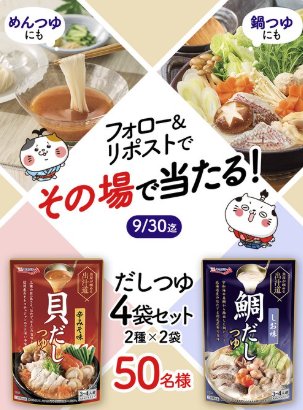懸賞情報その場で当たる鍋つゆ4袋セットがその場で50名様に当たるXキャンペーン 懸賞名:フォロー&RPキャンペーン当選賞品:鍋つゆ 4袋セット当選人数:50名様応募条件:X(Twitter)アカウントで毎日その場で当たる企業名:キョクヨー この懸賞に応募する(応募期間終了)2025年09月30日今すぐ応募可能な懸賞はコチラから 見逃せない懸賞ミルク商品モニター毎週400名様デジコ、オリジナルアイテム、豪華家電など賞品によって異なります無料で試せる「ベビー用スキンケア」のお得情報♪日本全国の厳選地酒1,001名様「果てしなきスカーレット」映画鑑賞券 / オリジナルバッグ付きフリースブランケット1,500組3,000名様 / 5,000名様オリジナルフレークシール~プレママver~応募者全員 応募可能な懸賞関連する当選報告 定期開催されているTOKYO FMのプレゼントキャンペーン♪随時開催ボートレース出場レーサーサイン入りグッズ入りやえらべるPayが当たるキャンペーン残り5日ジャングリア沖縄チケット&宿泊券も当たるファミマオンラインのクローズド懸賞残り9日【無料体験可能】子ども向け「習い事・プログラミング教室」残り355817日先着当選!キッザニア甲子園 江崎グリコデー招待券がもらえるクローズド懸賞2025年10月31日09:59(対象商品がなくなり次第終了)キーワードを集めて当たる!JAのメルマガ会員限定キャンペーン!定期開催 コノミヤのクローズド懸賞で「文楽親子劇場チケット」が当選しました!春日井製菓のTwitter懸賞で「ヒミツのプレゼント」が当選しました!サントリーのハガキ懸賞で「オールフリー1ケース」が当選しました☆日本アクセスのLINEクローズド懸賞で「LINEPay10,000円分」が当選しました☆オークワ&有名メーカーのハガキ懸賞で「ドールスムージー詰め合わせ」が当選しました♪ウエルシア×大塚製薬のキャンペーンで「ボディメンテ1ケース」が当選しました! 関連情報: X懸賞(Twitter懸賞)オープン懸賞毎日応募その場で当たるネット懸賞SNS懸賞食品・飲料懸賞情報 食品・グルメ詰め合わせ・セット HOME懸賞情報応募方法SNS懸賞X懸賞(Twitter懸賞)鍋つゆ4袋セットがその場で50名様に当たるXキャンペーン 2025年09月01日 更新:ものりんず@懸賞主婦【厳選】毎日応募 【全て】毎日応募