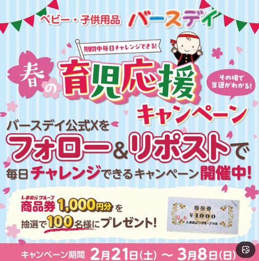 懸賞情報その場で当たる1,000円分のしまむらグループ共通商品券が当たるXキャンペーン 懸賞名:春の育児応援キャンペーン当選賞品:しまむらグループ商品券 1,000円分当選人数:100名様応募条件:X(Twitter)アカウントで毎日その場で当たる企業名:バースデイ@しまむらグループ この懸賞に応募する(応募期間終了)2026年03月08日今すぐ応募可能な懸賞はコチラから 見逃せない懸賞デジタルギフト 500円分毎月2,000名様EDWIN 特製ブルーGジャン / デニムバッグ / デニムコースター+一番搾り 糖質ゼロ100名様 / 500名様 / 1,000名様パンパース オムツ毎月1名様商品券 最大1万円分5,200名様すみっコぐらし ぷっくりシール / ピザーラネットクーポン 2,500円分2,000名様 / 100名様サンリオの幼児向け英語教材がお試しできる無料モニターキャンペーン 応募可能な懸賞関連する当選報告 放映中のアニメグッズやドラマ主題歌CDが当たるプレゼントキャンペーン!随時開催【妊婦さん&新米ママ向け】まなべびのプレゼントキャンペーン♪賞品によって異なります全プレ!最大30,000円分のえらべるPayがもらえる日立のお得なキャンペーン残り36日低刺激性スキンケアNOV(ノブ)の無料サンプルセットがもらえるキャンペーン☆定期開催ENHYPENオリジナルグッズや旅行券などが当たるクローズドキャンペーン残り25日2,000円分のAmazonギフトコードが当たるレシートキャンペーン残り25日 サントリーのハガキ懸賞で「サントリー 天然水6本アソートセット」が当選しました♪コスモス×ユニリーバのレシート懸賞で「シロカ電気圧力鍋」が当選しました☆モラタメのTwitter懸賞で「日本ハム冷凍食品 陳建一シリーズ」が当選しました♪フィール×キューピー×オタフク×キリンの懸賞で「キューピー工場見学&お好み焼き教室」が当選しました♪第2広報室「MAYBELLINE NEW YORK スーパー ミネラル コンシーラー ロングキープ」イオンのキャンペーンで「空気清浄機」が当選しました! 関連情報: X懸賞(Twitter懸賞)オープン懸賞育児・子育て懸賞毎日応募その場で当たるネット懸賞現金・金券・ギフト券SNS懸賞ベビー・キッズ・おもちゃ懸賞情報 高額賞品・高級品商品券・ギフト券・金券育児・子育てしまむら HOME懸賞情報応募方法SNS懸賞X懸賞(Twitter懸賞)1,000円分のしまむらグループ共通商品券が当たるXキャンペーン 2026年02月24日 更新:ものりんず@懸賞主婦【厳選】毎日応募 【全て】毎日応募