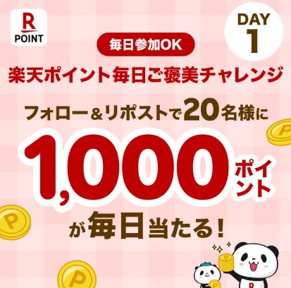 懸賞情報楽天ポイント1,000ポイントが当たる毎日応募Xキャンペーン 懸賞名:楽天ポイントで毎日ご褒美チャレンジキャンペーン当選賞品:楽天ポイント 1,000ポイント当選人数:20名様応募条件:X(Twitter)アカウントで毎日応募企業名:楽天ポイントギフト この懸賞に応募する2025年11月21日(残り4日) 見逃せない懸賞特大チョコパイBOX / えらべるPay 1,000ポイント500名様 / 1,000名様全額キャッシュバック合計9,190名様豪華賞品(月替り)賞品によって異なりますCoke ONドリンクチケット / PayPayポイント 500ポイント / BALMUDA ReBaker 他100,000名様 / 10,000名様 / 50名様 他ナンバーワン戦隊ゴジュウジャー オリジナルグッズ合計1,500名様ベビーカー / 抱っこ紐 / ベビーベッド / Amazonギフト 10,000円分 他1名様 / 1名様 / 1名様 / 3名様 他 応募可能な懸賞関連する当選報告 全プレもアリ!豪華賞品が当たる丸大のレシートキャンペーン2026年03月03日(全3回抽選)佐久間大介QUOカードやオリジナル猫グッズが当たるクローズドキャンペーン残り51日オリジナルQUOカードが当たる講談社の会員限定キャンペーン残り2日氷にも雪にも強いスタッドレスタイヤがお試しできる商品モニター懸賞2025年11月18日(全2回開催)指原莉乃プロデュースカラコンの新色セットがその場で当たるキャンペーン残り7日旅行券5万円や鶴居村ふるさと応援券なども当たる豪華タンチョウクイズキャンペーン!残り13日 APAISER「ベビーウェア」が当選しました☆SAPPORO「ホワイトベルグ12本」が当選しました☆hoyu「シエロ ヘアカラーEXクリーム」が当選しました☆フィール×サッポロのキャンペーンで「ヱビス4種の味わいセット」が当選しました!キンレイのキャンペーンで「お水がいらない ラーメン北魁4食セット」が当選しました♪GOO.N MOM コミュニティで「おむつ&おしりふきのセット」が当選しました☆ 関連情報: X懸賞(Twitter懸賞)オープン懸賞毎日応募ネット懸賞現金・金券・ギフト券SNS懸賞懸賞情報 電子マネー・ポイント楽天 HOME懸賞情報応募方法SNS懸賞X懸賞(Twitter懸賞)楽天ポイント1,000ポイントが当たる毎日応募Xキャンペーン 2025年11月17日 更新:ものりんず@懸賞主婦【厳選】毎日応募 【全て】毎日応募 クリスマス懸賞 年末年始懸賞