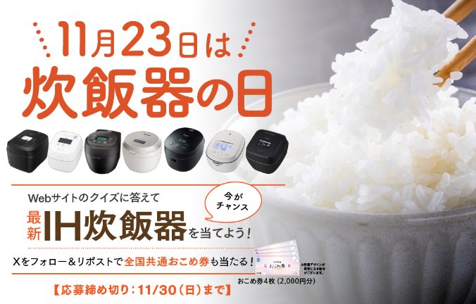 懸賞情報最新のIH炊飯器が当たる「炊飯器の日」クイズキャンペーン 懸賞名:11月23日は炊飯器の日キャンペーン当選賞品:最新のIH炊飯器当選人数:7名様応募条件:クイズに答えて応募企業名:日本電機工業会 この懸賞に応募する2025年11月30日(残り1日) 見逃せない懸賞ワンワンとあそぼうショー招待券合計1,400名様最大1,000Pontaポイント合計8,000名様Panasonic 電気圧力鍋 / Nintendo Switch / LOGOS ポップフルシェルター 他1名様 / 1名様 / 1名様 他えらべるPay 500ポイント / カスタムオーダーForペット2,400名様 / 100名様葬送のフリーレングッズ、えらべるPay など賞品によって異なります現金、カタログギフト、ギフトカードなど(月替り)賞品によって異なります 応募可能な懸賞関連する当選報告 宿泊券や豪華食品も当たる読売新聞の定期キャンペーン!定期開催ニッスイのまんぞくプレート詰め合わせが当たるLINEキャンペーン残り1日旅館・ホテルの宿泊券やご当地食材が当たる旅色の懸賞キャンペーン☆定期開催毎週開催☆めざましテレビで紹介されたお花が当たるキャンペーン定期開催ソニックレーシング クロスワールドのゲームソフトも当たるクローズドキャンペーン残り6日【定期開催】最新人気家電などが当たるエディオンのX懸賞!随時開催 buzzlife「カルピスのチカラを発見(アサヒ飲料株式会社)プロジェクト」東ハトのキャンペーンで「お菓子の詰め合わせ」が当選しました☆花王「Curel 泡ボディウォッシュ+ジェルローション」が当選しました!佐藤食品のハガキ懸賞で「新潟県産新之助」が当選しました!AGF「秋の新商品 3点セット」が当選しました♪大王製紙のLINE懸賞で「ワンワンとうーたんのいっしょに歌ってピアノ」が当選しました♪ 関連情報: オープン懸賞ネット懸賞家電・デジタル機器豪華・高額懸賞懸賞情報 高額賞品・高級品調理家電炊飯器 HOME懸賞情報応募方法ネット懸賞最新のIH炊飯器が当たる「炊飯器の日」クイズキャンペーン 2025年11月01日 更新:ものりんず@懸賞主婦【厳選】毎日応募 【全て】毎日応募 クリスマス懸賞 年末年始懸賞