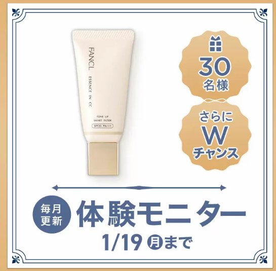 懸賞情報商品モニターファンケルのエッセンスイン CCがお試しできる商品モニターキャンペーン キャンペーン名:【無料モニター大募集!】 1本で素肌キレイ見せが叶う!軽めのファンデにもメイク下地にも。「エッセンスイン CC」当選賞品:エッセンスイン CC商品モニター当選人数:30名様応募条件:会員登録して応募企業名:ファンケルコメント:※モニター品到着後、ファンケルオンラインにて口コミを投稿してくださる方 など条件あり この懸賞に応募する2026年01月19日(残り5日) 見逃せない懸賞USJ 貸切チケット購入権7,000名様4K液晶テレビ / バルミューダ 空気清浄機 / Dyson 掃除機 他50名様 / 50名様 / 50名様 他現金、カタログギフト、ギフトカードなど(月替り)賞品によって異なりますお菓子詰め合わせ3,300名様QUOカード 3,000円分1,000名様AirPods Pro / ソーダストリーム / 40V型液晶テレビ / Princess テーブルグリル1名様 / 1名様 / 1名様 / 1名様 応募可能な懸賞関連する当選報告 濃厚チョコブラウニー詰め合わせやえらべるPayが当たるブルボンのレシート懸賞残り45日図書カードネットギフトがその場で当たるKADOKAWAのXキャンペーン残り8日全プレもアリ☆ベビー用品やテーマパークチケットも当たるキャンペーン♪常時募集中USJ 一部エリア貸切イベントのチケットやdポイントも当たる豪華懸賞残り17日最大10,000円分のこども商品券が当たる雪だるまコンテストキャンペーン残り4日育児グッズなどが当たる、フコク生命の毎月懸賞☆毎月開催 ココ・カラ。和歌山「旬の特産品プレゼントキャンペーン」ヤマナカ×プリマハムのレシート懸賞で「レゴランド・ジャパン 1DAYパスポート」が当選しました!お財布.com「Amazonギフト券10,000円分」が当選しました☆株式会社I-neのキャンペーンで「RUBY MUSHROOM」詰め合わせが当選しました☆タカラトミー「リカちゃんをはじめよう!ドリームキャンペーン」第一生命「ファインディング・ドリー ムビチケカード」が当選しました☆ 関連情報: オープン懸賞ネット懸賞商品モニター美容・健康・コスメ懸賞情報 限定条件あり懸賞化粧品・コスメ会員登録ファンケル HOME懸賞情報応募方法ネット懸賞ファンケルのエッセンスイン CCがお試しできる商品モニターキャンペーン 2025年12月17日 更新:ものりんず@懸賞主婦【厳選】毎日応募 【全て】毎日応募 年末年始懸賞