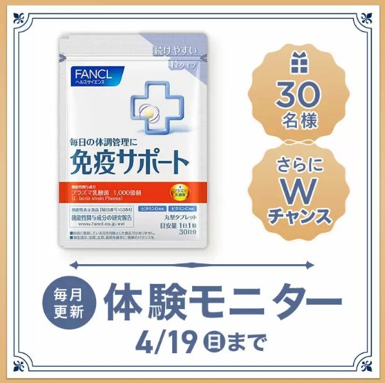 懸賞情報商品モニターファンケルの免疫サポート 粒タイプがお試しできる商品モニターキャンペーン キャンペーン名:【体験モニター大募集!】 ビタミンCやビタミンDも1日摂取目安量を配合。毎日の習慣のために続けやすい「免疫サポート 粒タイプ」当選賞品:免疫サポート 粒タイプ商品モニター当選人数:30名様応募条件:会員登録して応募企業名:ファンケルコメント:※モニター品到着後、ファンケルオンラインにて口コミを投稿してくださる方 など条件あり この懸賞に応募する2026年04月19日(残り2日) 見逃せない懸賞京都 たち吉謹製 京皿セット2,000名様カレ・ド・ショコラ <スペリオリテ>毎月900名様日本旅行で使えるクーポン対象者全員電子マネー 最大10,000円分2,330名様QUOカードPay 最大1万円分合計10,000名様カウネット オリジナル商品毎月50名様 応募可能な懸賞関連する当選報告 秋田県産 桃豚が当たるJAグループ秋田のお米購入キャンペーン残り13日茨城の名産品が当たるクイズキャンペーン!定期開催ちいかわのオリジナルUVキーホルダーが600名様に当たるクローズドキャンペーン残り13日お店では売っていない特別なカレ・ド・ショコラが当たるレシートキャンペーン!毎月末日ダリヤ商品の詰め合わせが当たる白髪川柳投稿キャンペーン!毎月開催毎月抽選!選べるギフトが当たる、三井住友海上あいおい生命のアンケート懸賞毎月末日 ヤマサ「怪獣QUOカード1,000円分」が当選しました!バロー×LOTTEのハガキ懸賞で「カタログギフト」が当選しました☆おやつカンパニーのキャンペーンで「お菓子詰め合わせ」が当選しました♪ツルハ×P&Gのクローズド懸賞で「P&G商品セット」が当選しました!コノミヤ・日清フーズのハガキ懸賞で「クリスマスケーキ」が当選しました☆バロー×雪印メグミルクのハガキ懸賞で「コードレス電動ブラシ」が当選しました! 関連情報: オープン懸賞ネット懸賞商品モニター美容・健康・コスメ懸賞情報 限定条件あり懸賞サプリ・薬健康・ヘルスケア会員登録ファンケル HOME懸賞情報応募方法ネット懸賞ファンケルの免疫サポート 粒タイプがお試しできる商品モニターキャンペーン 2026年03月24日 更新:ものりんず@懸賞主婦【厳選】毎日応募 【全て】毎日応募