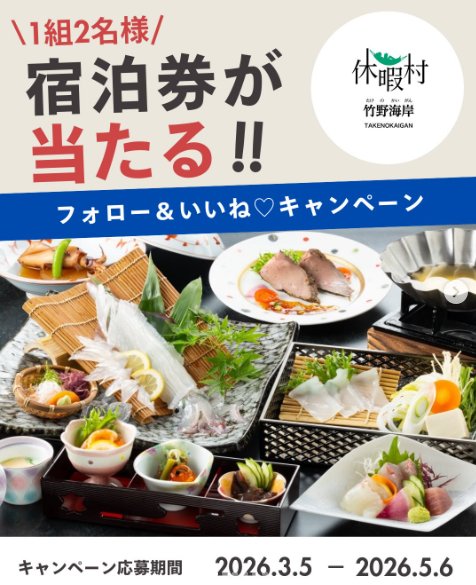 懸賞情報【兵庫】休暇村 竹野海岸の1泊2食付ペア宿泊券が当たる高額懸賞 懸賞名:宿泊券が当たる!フォロー&いいねキャンペーン 第14弾当選賞品:休暇村竹野海岸 1泊2食ペア宿泊券 60,000円相当当選人数:1組様応募条件:Instagramアカウントで応募企業名:休暇村 竹野海岸 この懸賞に応募する2026年05月06日(残り13日) 見逃せない懸賞国内旅行券 5万円分 / 辛ラー鍋 / 辛ラーメンセット / 15%割引アプリクーポン10名様 / 10名様 / 50名様 / 100,000名様レッドブル・レーシング 限定デザイングッズ2,500名様ディズニグッズ賞品によって異なりますクリスピーチキン無料クーポン5,000名様テンスター カラーシャンプー無料サンプル対象者全員電動自転車 / ベビーラック / iRobot ルンバ ほか合計1,098名様 応募可能な懸賞関連する当選報告 500名様に選べるプレゼントが当たるドマークを集めて応募しよう!キャンペーン残り7日豪華ゴルフ用品が当たる会員限定毎月キャンペーン☆随時開催特製アクリルキーホルダーが当たるムビチケ前売り券購入者限定キャンペーン残り5日【ジョイフル本田×P&G】Wチャンスもアリ!Visa eギフトが当たる豪華キャンペーン残り1日毎月開催♪岩崎書店の子ども向けの本が当たるキャンペーン!毎月末日Wチャンスもアリ!5,000円分のギフトカードが当たる白元アースの豪華懸賞2026年05月31日(全2回抽選) パナソニック「CLUB Panasonic 『浄水器・製水器カートリッジを調べよう!キャンペーン』」JA全農のキャンペーンで「お米1俵」が当選しましたー!佐藤製薬のハガキ懸賞で「iRobot ルンバ960」が当選しました☆スギヤマ×meijiのハガキ懸賞で「”新”アミノコラーゲン」の無料モニターに当選しました♪日清冷凍食品のTwitter懸賞で「和風6麺シリーズ&Amazonギフト券5,000円分」が当選しました♪Suntory「ボスブラックのトクホ8月18日(火)に新発売! 発売前先行モニター6,000名様募集!キャンペーン」の『Wチャンスキャンペーン』 関連情報: オープン懸賞旅行・宿泊ネット懸賞Instagram懸賞豪華・高額懸賞SNS懸賞懸賞情報 高額賞品・高級品宿泊券・旅行券近畿(大阪・京都・兵庫・奈良・滋賀・和歌山) HOME懸賞情報応募方法ネット懸賞【兵庫】休暇村 竹野海岸の1泊2食付ペア宿泊券が当たる高額懸賞 2026年04月21日 更新:ものりんず@懸賞主婦【厳選】毎日応募 【全て】毎日応募