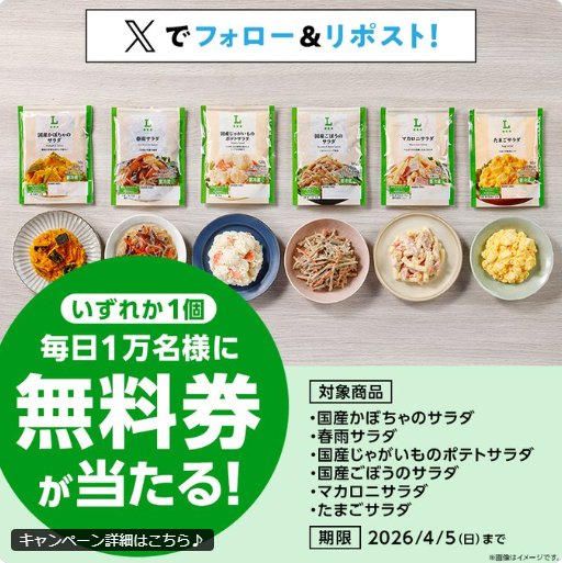 懸賞情報その場で当たる対象のローソンオリジナルパウチサラダ無料券が当たる大量当選X懸賞 懸賞名:毎日1万名様に抽選で「対象のローソンオリジナルパウチサラダ」無料券をプレゼント!当選賞品:ローソンオリジナルパウチサラダ無料券当選人数:毎日1万名様応募条件:X(Twitter)アカウントで毎日その場で当たる企業名:ローソン この懸賞に応募する2026年04月05日(残り4日) 見逃せない懸賞くだものトリス〈れもんハイボール〉1,000名様PayPayポイント 300円分1,000名様パンパース オムツ毎月1名様フライパンセット / 手のりたまクッション / 丸美屋商品セット毎週250名様 / 毎週250名様 / 5,000名様ナルミヤキャラクターズ限定グッズ1,100名様ロボット掃除機 / ミラーレス一眼カメラ / ホームベーカリー / リフトロジー 他5名様 / 5名様 / 15名様 / 15名様 他 応募可能な懸賞関連する当選報告 オリジナルタンブラーやプラネタリウムが当たるサントリーのクローズド懸賞残り43日野球観戦チケットや映画鑑賞券も当たる中日新聞のキャンペーン!随時開催アラウ.ベビーのマタニティクリームがお試しできるキャンペーン!毎月末日【対象店舗×味の素×サントリー】チェーン商品券やギフトカードも当たるレシート懸賞残り19日サントリー賞品や豪華家電が当たるコツコツ懸賞♪残り90日毎月開催!JAさがのおすすめ商品などが当たるアンケートキャンペーン毎月末日17:00 味の素のハガキ懸賞で「ドリッパー+クリーマー」が当選しました♪@cosmeのキャンペーンで「ソフラン アロマリッチ 香りのミスト」が当選しました!日本ハムのハガキ懸賞で「新型PlayStation4本体」が当選しましたー☆Daihatsu「WAKEとドデカク出かけようキャンペーンについてのアンケート」平和堂×伊藤ハムのハガキ懸賞で「USJ 1デイ・スタジオ・パス」が当選しました!バロー×おやつカンパニーのハガキ懸賞で「名古屋港水族館親子チケット」が当選しました! 関連情報: X懸賞(Twitter懸賞)オープン懸賞毎日応募その場で当たるネット懸賞大量当選無料クーポン・引換券SNS懸賞狙い目・穴場懸賞懸賞情報 食品・グルメクーポン・無料券ローソン HOME懸賞情報応募方法SNS懸賞X懸賞(Twitter懸賞)対象のローソンオリジナルパウチサラダ無料券が当たる大量当選X懸賞 2026年04月01日 更新:ものりんず@懸賞主婦【厳選】毎日応募 【全て】毎日応募