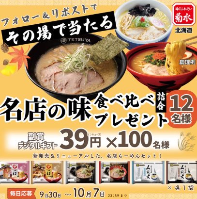 懸賞情報その場で当たる菊水のラーメンセットやデジタルギフトがその場で当たるキャンペーン 懸賞名:フォロー&リポストキャンペーン当選賞品&当選人数:ラーメンセット(12名様)デジタルギフト 39円分(100名様)応募条件:X(Twitter)アカウントで毎日その場で当たる企業名:菊水 この懸賞に応募する(応募期間終了)2025年10月07日今すぐ応募可能な懸賞はコチラから 見逃せない懸賞BRUNO コンパクトホットプレート / dancyu グルメギフトカタログ 他20名様 / 40名様 他デジコ、オリジナルアイテム、豪華家電など賞品によって異なりますベルメゾンのおすすめ商品(毎週変動)賞品によって異なりますハリボークッション1,000名様乃木坂46アクスタ / PayPayポイント 100ポイント100名様 / 5,000名様豪華賞品(月替り)賞品によって異なります 応募可能な懸賞関連する当選報告 毎月「WILKINSON」1ケースが当たるラジオ局の楽曲リクエストコーナー♪毎週開催AGF商品やオリジナルマグカップなどが当たるポイントキャンペーン締切日不明ROCKET 3 STORM Rの体験モニター募集キャンペーン残り7日【万代×プリマハム】宝塚歌劇 花組貸切公演 ご招待キャンペーン残り17日最大1,700円分のQUOカードPayが当たるX予想キャンペーン2026年03月27日(大井競馬開催日のみ)【セイムス】セイムスポイントやヒロアカQUOカードPayなどが当たるキャンペーン残り13日 レックのキャンペーンで「ボリューム満点焼肉セット」が当選しました☆ニチベイ×ハローキティの懸賞で「ハローキティクリアファイル」が当選しました☆東芝のキャンペーンで「新鮮フルーツセット」が当選しました♪エスビー食品の懸賞で「ティファール フレンチパン」が当選しました♪MONIPLA「ユニリーバ CLEAR モニプラキャンペーン」LOTTE「オーラテクトガム」が当選しました♪ 関連情報: X懸賞(Twitter懸賞)オープン懸賞毎日応募その場で当たるネット懸賞現金・金券・ギフト券SNS懸賞食品・飲料懸賞情報 食品・グルメ詰め合わせ・セットギフトコード|デジタルギフト菊水 HOME懸賞情報応募方法SNS懸賞X懸賞(Twitter懸賞)菊水のラーメンセットやデジタルギフトがその場で当たるキャンペーン 2025年09月30日 更新:ものりんず@懸賞主婦【厳選】毎日応募 【全て】毎日応募