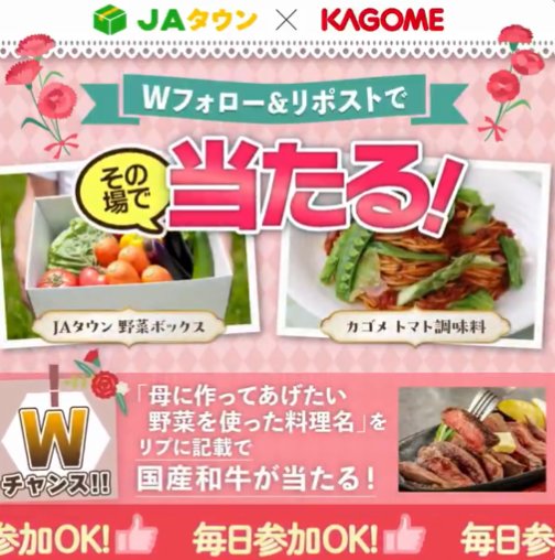 懸賞情報その場で当たるJAの野菜BOXとカゴメ商品セットがその場で12名様に当たるキャンペーン 懸賞名:じぇー太 からプレゼント当選賞品:野菜BOX+カゴメ商品当選人数:12名様応募条件:X(Twitter)アカウントで毎日その場で当たる企業名:JAタウン この懸賞に応募する2026年05月04日(残り7日) 見逃せない懸賞Biore UV×StrayKidsコラボ限定グッズ2,500名様カレ・ド・ショコラ <スペリオリテ>毎月900名様オリジナルフレークシール~プレママver~応募者全員evercook フライパン1,500名様Yunth ❘ Vのオリジナルステッカー / Yunth豪華セット1,000名様 / 100名様Amazonギフト券 10,000円分 / ジェラートピケ ママバッグ3名様 / 1名様 応募可能な懸賞関連する当選報告 全プレもアリ☆ベビー用品やテーマパークチケットも当たるキャンペーン♪常時募集中人気のエルサやアナのグッズが当たるInstagram投稿キャンペーン残り48日人気の育児グッズやテーマパークチケットなどが当たる豪華ママ・プレママさん向けキャンペーン!残り3日興和の素敵なプレゼントが当たる会員限定キャンペーン!残り3日ごろグラ×SWIMMERのごきげんグッズやごろグラセットが当たるクローズドキャンペーン2026年07月31日(全2回開催)毎月開催!サンリオピューロランド デイパスポートが当たる会員限定キャンペーン毎月10日〜24日(毎月開催) Boome「ギフト券2,000円分を100名様にプレゼント!!」お財布.com「Amazonギフト券10,000円分」が当選しました☆丸美屋の懸賞で「丸美屋商品詰め合わせ」が当選しました!バロー・キリンのハガキ懸賞で「商品券 1,000円分」が当選しました☆エバラのキャンペーンで「ご当地牛12ヶ月分」が当選しました☆サッポロビールのTwitter懸賞で「こいむぎ 1ケース」が当選しました! 関連情報: X懸賞(Twitter懸賞)オープン懸賞毎日応募その場で当たるネット懸賞SNS懸賞食品・飲料懸賞情報 食品・グルメ詰め合わせ・セット調味料・料理の素野菜・フルーツJA|農協カゴメ HOME懸賞情報応募方法SNS懸賞X懸賞(Twitter懸賞)JAの野菜BOXとカゴメ商品セットがその場で12名様に当たるキャンペーン 2026年04月22日 更新:ものりんず@懸賞主婦【厳選】毎日応募 【全て】毎日応募