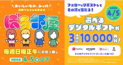 懸賞情報その場で当たるデジタルギフト10,000円分がその場で当たる豪華Xキャンペーン 懸賞名:フォロー&リポストキャンペーン当選賞品:デジタルギフト 10,000円分当選人数:3名様応募条件:X(Twitter)アカウントでその場で当たる企業名:KBC九州朝日放送 この懸賞に応募する(応募期間終了)2026年04月05日今すぐ応募可能な懸賞はコチラから 見逃せない懸賞えらべるPay 100ポイント30,000本すこやかM1サンプル / 赤ちゃんに届くDHAサンプル毎月1,000名様 / 毎月500名様オリジナル名入れ絵本ダウンロードデータ対象者全員オリエンタルカレーオリジナルグッズ毎月500名様Jリーグ観戦チケット合計150,000名様ベルメゾンのおすすめ商品(毎週変動)賞品によって異なります 応募可能な懸賞関連する当選報告 サーティワン貸切食べ放題イベント招待も当たる投票キャンペーン残り8日1,000名様にAmazonギフトカード200円分がその場で当たるXキャンペーン残り8日図書カードネットギフトが当たるアンケートキャンペーン!毎月抽選毎週開催☆めざましテレビで紹介されたお花が当たるキャンペーン定期開催ステーキガストの500円分食事券がその場で当たるXキャンペーン(本日最終日!!)ディズニー”ファンタイム・ウィズ・トイ・ストーリー5” の貸切イベント招待券が当たる豪華懸賞残り28日 東海漬物のハガキ懸賞で「日本3大和牛のカレーセット」が当選しました♪J:COMのキャンペーンで「生牡蠣2キロ」が当選しました!フィニッシュ「やさしくて強いママ応援キャンペーン」が当選しました☆コノミヤのクローズド懸賞で「酒類詰め合わせ」が当選しました!揖保乃糸のハガキ懸賞で「片手鍋&フライパン」が当選しました♪S&B「本生 生しょうがセット」 関連情報: X懸賞(Twitter懸賞)オープン懸賞ネット懸賞その場で当たる現金・金券・ギフト券豪華・高額懸賞SNS懸賞懸賞情報 高額賞品・高級品ギフトコード|デジタルギフト HOME懸賞情報応募方法SNS懸賞X懸賞(Twitter懸賞)デジタルギフト10,000円分がその場で当たる豪華Xキャンペーン 2026年04月01日 更新:ものりんず@懸賞主婦【厳選】毎日応募 【全て】毎日応募