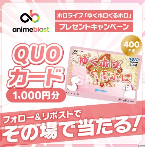 懸賞情報その場で当たる1,000円分のQUOカードもその場で当たる毎日応募Xキャンペーン 懸賞名:オリジナルQUOカードキャンペーン当選賞品:QUOカード 1,000円分当選人数:400名様応募条件:X(Twitter)アカウントで毎日その場で当たる企業名:anime blast この懸賞に応募する2026年01月13日(残り13日) 見逃せない懸賞ディズニーシー パークチケット対象者全員豪華グルメ、図書カードネットギフト など合計1,405名様豪華賞品(月替り)賞品によって異なりますヘナカラートリートメント無料サンプル応募者全員オリジナルマグカップ / QUOカードPay 最大1,000円分300名様 / 700名様バーバパパグッズ / レコルト 自動調理ポット / ベビーキャリア 他対象者全員 / 2名様 / 2名様 他 応募可能な懸賞関連する当選報告 イトメン製品&オリジナルレシピブックが当たる大量当選ハガキ懸賞2026年04月03日(全2回抽選)BYDの新車購入時に使える最大100万円分のクーポンが当たるお年玉懸賞2026年01月31日(全2回開催)えらべるPay3,000ポイントが当たるグリコのクローズドキャンペーン残り31日毎月開催!ビーンスターク商品がお試しできるプレゼントキャンペーン(本日最終日!!)【全道アークスグループ×プリマハム】東京ディズニーランド ザ・ダイヤモンドホースシュー 貸切ご招待残り3日定期開催されているTOKYO FMのプレゼントキャンペーン♪随時開催 NET ViVi「Carina パウチサンプリングプレゼント」コンビのキャンペーンで「QUOカード500円分」が当選しました!「キッザニア招待券」がNISSEIのキャンペーンで当選しました♪YogiboのTwitter懸賞で「Yogiboインゴットチョコ」が当選しました♪キユーピーのキャンペーンで「USJスタジオ・パス」が当選しました!フィール×伊藤ハムのクローズド懸賞で「伊藤ハム商品詰め合わせ」が当選しました! 関連情報: X懸賞(Twitter懸賞)オープン懸賞毎日応募ネット懸賞その場で当たる現金・金券・ギフト券SNS懸賞懸賞情報 QUOカード HOME懸賞情報応募方法SNS懸賞X懸賞(Twitter懸賞)1,000円分のQUOカードもその場で当たる毎日応募Xキャンペーン 2025年12月31日 更新:ものりんず@懸賞主婦【厳選】毎日応募 【全て】毎日応募 クリスマス懸賞 年末年始懸賞