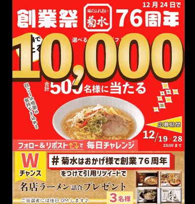 懸賞情報その場で当たる最大10,000円分のデジタルギフトがその場で当たるXキャンペーン 懸賞名:フォロー&リポストキャンペーン当選賞品:デジタルギフト 最大10,000円分当選人数:500名様応募条件:X(Twitter)アカウントで毎日その場で当たる企業名:菊水 この懸賞に応募する(応募期間終了)2025年12月28日今すぐ応募可能な懸賞はコチラから 見逃せない懸賞JTBトラベルギフト 10万円分 / ビスケット詰め合わせ28名様 / 2,280名様東京ディズニーリゾート・パークチケット / JCBギフトカード 2,000円分100組200名様 / 1,000名様現金、カタログギフト、ギフトカードなど(月替り)賞品によって異なりますベビー育児グッズ、ギフト券など賞品によって異なりますえらべるPay 20円分 / サーティワン アイスクリーム 500円ギフト券 / Amazonギフトカード 1,000円分 他99,800名様 / 80名様 / 30名様 他コズレオリジナルデザイン「出生届」メルマガ登録して必ずもらえる 応募可能な懸賞関連する当選報告 ご当地グルメやとっておきの逸品を無料でお試しできるモニターキャンペーン!随時開催世界で一つだけのオリジナル名入れ絵本を作れる会員登録キャンペーン常時募集中Amazonギフトカード最大10,000円分が当たる豪華おみくじキャンペーン残り2日1万円分のQUOカードが当たるTHERMOSの製品アンケートキャンペーン!年2回抽選アマギフやジェラートピケの育児アイテムが当たる豪華アンケートキャンペーン残り48日TinyTANデザインドリンクチケットやPayPayポイントが当たる大量当選懸賞残り50日 FEEL×東洋水産のハガキ懸賞で「FEEL商品券 2,000円分」が当選しました☆ダイショーのハガキ懸賞で「オリジナルもつ鍋セット」が当選しました☆Boome「ギフト券2,000円分を100名様にプレゼント!!」光文社のハガキ懸賞で「ダイショー 食卓の1品詰め合わせ」が当選しました!ヤマナカ×プリマハムのレシート懸賞で「レゴランド・ジャパン 1DAYパスポート」が当選しました!Barilla 「パスタお試しセット」が当選しました! 関連情報: X懸賞(Twitter懸賞)オープン懸賞毎日応募ネット懸賞その場で当たる豪華・高額懸賞現金・金券・ギフト券SNS懸賞懸賞情報 高額賞品・高級品ギフトコード|デジタルギフト菊水 HOME懸賞情報応募方法SNS懸賞X懸賞(Twitter懸賞)最大10,000円分のデジタルギフトがその場で当たるXキャンペーン 2025年12月19日 更新:ものりんず@懸賞主婦【厳選】毎日応募 【全て】毎日応募 年末年始懸賞
