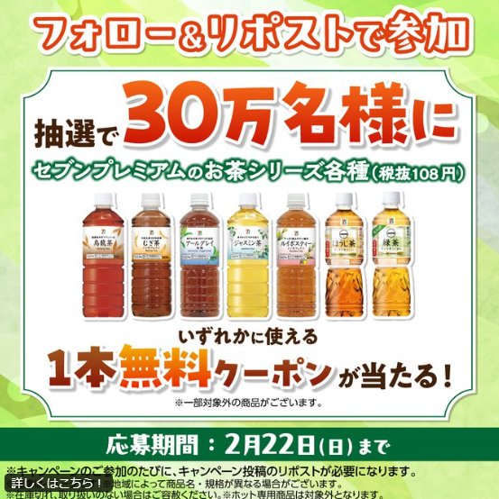 懸賞情報その場で当たるセブン-イレブンの対象お茶無料クーポンがその場で当たる大量当選X懸賞 懸賞名:フォロー&リポストキャンペーン当選賞品:対象のお茶無料クーポン当選人数:30万名様応募条件:X(Twitter)アカウントで毎日その場で当たる企業名:セブン‐イレブン この懸賞に応募する(応募期間終了)2026年02月22日今すぐ応募可能な懸賞はコチラから 見逃せない懸賞図書カードネットギフト 1,000円分1,000名様全国共通おこめ券各回2,500名様サンリオの幼児向け英語教材がお試しできる無料モニターキャンペーンJCBギフトカード 3,000円分 / クッション / CIAO缶シリーズ 1ケース1,000名様 / 応募券を集めて必ずもらえる / 応募券を集めて必ずもらえるグ~ン おむつサンプル毎月10,000名様子どもにピッタリの教材が見つかる!幼児向け教材をまとめました♪ 応募可能な懸賞関連する当選報告 【ママさん・妊婦さん限定】全プレもアリ☆豪華プレゼントキャンペーン♪毎月抽選たらみゼリー6個詰め合わせセットがその場で当たるXキャンペーン残り1日京都 たち吉謹製 京皿セットが当たるサントリーのクローズドキャンペーン残り43日毎月開催!ワコール製品が当たるメンバー限定キャンペーン残り4日カバーマークのカバーマーク オリジナル アイカラーパレットが当たるLINEキャンペーン残り2日毎月抽選で豪華賞品が当たるネスレのLINEキャンペーン2026年08月31日(毎月開催) 株式会社I-neのキャンペーンで「RUBY MUSHROOM」詰め合わせが当選しました☆AEON SQUARE「新ヘルシア緑茶 6本セット」が当選しました☆P&G「PANTENE トリコン・アンバサダーセット」が当選しました♪ココカラファイン×中部薬品×カルビー×サントリーのハガキ懸賞で「浜松餃子」が当選しました☆ポチカム「Wチャンス【無料モニター募集】新しくなったパンテーンで「あの頃のバージンヘア」へ!」コスモス×ユニリーバのレシート懸賞で「シロカ電気圧力鍋」が当選しました☆ 関連情報: X懸賞(Twitter懸賞)オープン懸賞毎日応募その場で当たるネット懸賞大量当選無料クーポン・引換券SNS懸賞狙い目・穴場懸賞懸賞情報 ドリンク・飲料クーポン・無料券お茶・紅茶セブンイレブン HOME懸賞情報応募方法SNS懸賞X懸賞(Twitter懸賞)セブン-イレブンの対象お茶無料クーポンがその場で当たる大量当選X懸賞 2026年02月16日 更新:ものりんず@懸賞主婦【厳選】毎日応募 【全て】毎日応募