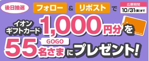 懸賞情報イオンギフトカード1,000円分が55名様に当たる毎日応募Xキャンペーン 懸賞名:フォロー&リポストキャンペーン当選賞品:イオンギフトカード 1,000円分当選人数:55名様応募条件:X(Twitter)アカウントで毎日応募企業名:イオン この懸賞に応募する2025年10月31日(残り20日) 見逃せない懸賞Amazonギフトカード 1,000円分毎月200名様Amazonギフトカード 最大10,000円分毎月1,000名様オリジナル名入れ絵本ダウンロードデータ対象者全員コンビニ無料クーポン 他合計3,000本 他二宮和也QUOカード1,000名様デジタルギフト 最大5,000円分合計73名様 応募可能な懸賞関連する当選報告 QBBベビチセット+専用カッターがその場で111名様に当たるキャンペーン(本日最終日!!)毎週開催!もち吉の会員限定プレゼントキャンペーン残り4日クレヨンしんちゃんグッズやデジタルギフトが当たるライオンのクローズド懸賞2026年01月13日(賞品によって異なります)QUOカードPay3,000円分が当たるキーワード投稿キャンペーン平日毎朝05:50~9:00ポケモン・ガリガリ君 メガワンタッチテントが当たる赤城乳業のハガキ懸賞2025年10月31日(全3回開催)【Yストア×グリコ】ペアランチ食事券やセレクション・ザ・グリコも当たるキャンペーン残り20日 「みんなで選ぼう!AMD アンバサダーコンテスト」明色化粧品のキャンペーンで「薬用美白エッセンスクリーム」の商品モニターに当選しました☆スギ薬局×ユニリーバのハガキ懸賞で「商品券 1,000円分」が当選しました♪伊藤ハム「ユニバーサル・スタジオ・ジャパン スタジオ・パス」が当選しましたー!DANONE「ダノンキッズシリーズ製品」が当選しました☆Suntory「ボス レインボーマウンテンブレンド セット」が当選しました! 関連情報: X懸賞(Twitter懸賞)オープン懸賞毎日応募ネット懸賞現金・金券・ギフト券SNS懸賞懸賞情報 商品券・ギフト券・金券AEON|イオン HOME懸賞情報応募方法SNS懸賞X懸賞(Twitter懸賞)イオンギフトカード1,000円分が55名様に当たる毎日応募Xキャンペーン 2025年10月01日 更新:ものりんず@懸賞主婦【厳選】毎日応募 【全て】毎日応募