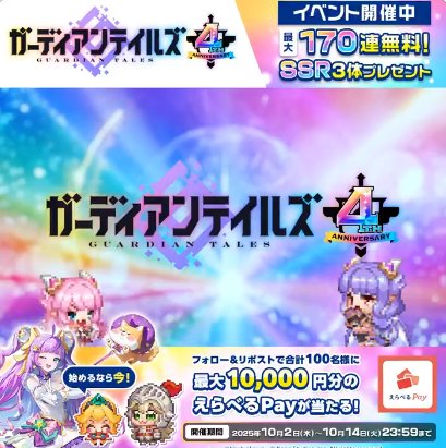 懸賞情報その場で当たる最大10,000円分のえらべるPayがその場で当たるXキャンペーン 懸賞名:ガデテル夏イベント当選賞品:えらべるPay 最大10,000円分当選人数:100名様応募条件:X(Twitter)アカウントでその場で当たる企業名:ガーディアンテイルズ この懸賞に応募する(応募期間終了)2025年10月14日今すぐ応募可能な懸賞はコチラから 見逃せない懸賞デジタルポイント 最大5万円分 / はぴだんぶいキャラクタールーム宿泊券 他各回15,070名様 / 各回5組10名様 他Amazonギフト券 100円分2,500名様オリジナル名入れ絵本ダウンロードデータ対象者全員電子ギフト 最大51,000円分2,000名様ギフトペイ 最大3万円分不明BEAUTY & YOUTH UNITED ARROWS コラボPCリュック / e-GIFT 3,000円分1,000名様 / 500名様 応募可能な懸賞関連する当選報告 全プレもアリ【ママさん・妊婦さん限定】豪華プレゼントキャンペーン♪残り153日毎月開催!JA宮崎の広報誌アンケートキャンペーン!毎月開催人気漫画『宇宙兄弟』とコラボレーションしたカレンダーが当たる豪華キャンペーン残り9日図書カードネットギフトが当たるアンケートキャンペーン!毎月抽選ミセス∞ハウスのコラボアイテムやハウス商品詰め合わせが当たるキャンペーン残り2日大人おつまみが自宅で体験できるミールキットが当たるクローズドキャンペーン残り17日 しんきん「グルメギフト 『旬彩カタログ しんきんのつなぐ力』絆コース」が当選しました!米国食肉輸出連合会「ビーフといえば、アメリカン。夏の宝探しキャンペーン」LIXILビバ&花王のハガキ懸賞で「Panasonicヘアドライヤー」が当選しました☆月刊Cheek「プレゼント企画~mandom Baby Veil ヘアフレグランス~」HOT PEPPER Beauty × ポンパレ「春のパーマスタイル × リーゼ特別プレゼント企画」に当選しました☆日本ルナ「バニラヨーグルト」の新商品モニターに当選しました! 関連情報: X懸賞(Twitter懸賞)オープン懸賞ネット懸賞その場で当たる豪華・高額懸賞現金・金券・ギフト券SNS懸賞懸賞情報 高額賞品・高級品電子マネー・ポイント HOME懸賞情報応募方法SNS懸賞X懸賞(Twitter懸賞)最大10,000円分のえらべるPayがその場で当たるXキャンペーン 2025年10月07日 更新:ものりんず@懸賞主婦【厳選】毎日応募 【全て】毎日応募 クリスマス懸賞 年末年始懸賞