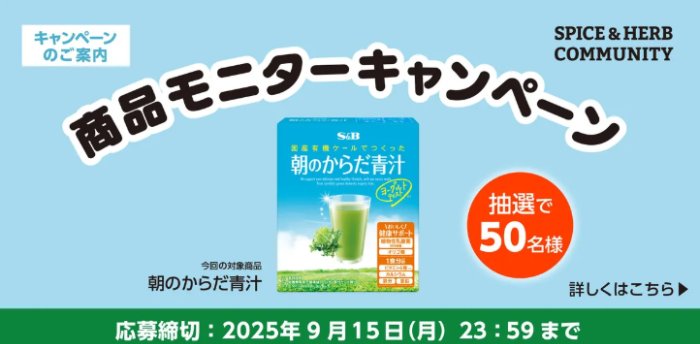 懸賞情報商品モニターエスビー食品の「朝のからだ青汁」がお試しできる商品モニター募集キャンペーン キャンペーン名:「朝のからだ青汁」モニターキャンペーン当選賞品:朝のからだ青汁 商品モニター当選人数:50名様応募条件:会員登録して応募企業名:エスビー食品コメント:※アンケート回答にご協力いただくこと など条件あり この懸賞に応募する(応募期間終了)2025年09月15日今すぐ応募可能な懸賞はコチラから 見逃せない懸賞BALMUDAトースター or ヘアドライヤー or タイガー炊飯器 or 掃除機 他300名様 他ビオレおすすめサンプルセット不明子どもにピッタリの教材が見つかる!幼児向け教材をまとめました♪目黒蓮 オリジナルアイウェアスタンド3,000名様トイ・ストーリー・ホテル宿泊+ディズニー・プライベート・パーティー招待券 他30組84名様 他気になっていたあの商品をお得に試せるサイト「サンプル百貨店」 応募可能な懸賞関連する当選報告 TinyTANコラボデザイングッズやPayPayポイントが当たる大量当選キャンペーン残り92日ガシャポンオンラインで使える1,000円相当のクーポンが当たるLINEキャンペーン毎月開催毎日100名様にえらべるPay500円相当がその場で当たるXキャンペーン残り2日【ゆめタウン×プリマハム】宝塚歌劇 花組貸切公演 ご招待キャンペーン残り22日葉酸800μg配合のエレビット無料サンプルがもらえるキャンペーン☆なくなり次第終了毎月50名様に素敵なプレゼントが当たる、ママ向け読み聞かせチャレンジ!毎月抽選 アピタ・ピアゴ×P&Gのキャンペーンで「SHARPプラズマクラスター保湿器」が当選しました!カゴメのキャンペーンで「トマト苗 凛々子」が当選しました!日清食品「日清焼そばU.F.O.フライングスピーカー」が当選しました☆DHC「濃密コラーゲン!美容ドリンク 3本セット」花王「Wチャンス賞 バブ アロマティックローズ」が当選しました♪コノミヤ×日清のハガキ懸賞で「クリスマスケーキ」が当選しました☆ 関連情報: オープン懸賞ネット懸賞商品モニター食品・飲料懸賞情報 限定条件あり懸賞ドリンク・飲料会員登録S&B HOME懸賞情報応募方法ネット懸賞エスビー食品の「朝のからだ青汁」がお試しできる商品モニター募集キャンペーン 2025年09月12日 更新:ものりんず@懸賞主婦【厳選】毎日応募 【全て】毎日応募