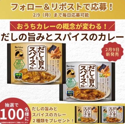 懸賞情報ハウスのだしの旨みとスパイスのカレーが当たる毎日応募Xキャンペーン 懸賞名:1月22日はカレーの日キャンペーン当選賞品:だしの旨みとスパイスのカレー当選人数:100名様応募条件:X(Twitter)アカウントで毎日応募企業名:ハウス食品 この懸賞に応募する(応募期間終了)2026年02月09日今すぐ応募可能な懸賞はコチラから 見逃せない懸賞オリジナル保冷バッグ / オリジナルレジャーマット500名様 / 500名様ハウステンボス 1DAYパスポート付き オフィシャルホテル宿泊券 他16組32名様 他【無料体験可能】子ども向け「習い事・プログラミング教室」ハローキティぬいぐるみ / グルメカタログギフト / えらべるPay 500円相当10,000名様 / 6,000名様 / 2,000名様スターバックスeGift 最大10,000円分8,010名様無料で試せる「ベビー用スキンケア」のお得情報♪ 応募可能な懸賞関連する当選報告 JCBギフトカードがその場で当たる伊藤ハムのクローズドキャンペーン残り10日ディズニーチケットやギフトカードが当たるコカ・コーラの豪華クローズドキャンペーン残り30日新型トナーレプレスイベント招待も当たるAlfa Romeoの豪華キャンペーン2026年03月17日(賞品によって異なります)毎月開催!文具や事務用品などが当たるナカバヤシのキャンペーン定期開催1,500名様に素敵なアイテムが当たるサクマいちごみるく55周年キャンペーン2026年03月31日(全3回抽選)ディズニー『”ファンタイム・ウィズ・トイ・ストーリー5” プライベート・イブニング・パーティー』招待券が当たる豪華懸賞残り25日 日本製粉のハガキ懸賞で「オーマーシリーズ 5品」が当選しました!平和堂・アサヒビールのハガキ懸賞で「ホーローチーズフォンデュ鍋セット」が当選しました!日清のキャンペーンで「Amazonギフト券 5,000円分」が当選しました!第2広報室「株式会社はつが cocomero 無料サンプル」アース製薬のハガキ懸賞で「アース製薬ギフトセット」が当選しました!花王「SOFINA iP クロロゲン酸 飲料」の無料モニターに当選しました! 関連情報: X懸賞(Twitter懸賞)オープン懸賞毎日応募ネット懸賞SNS懸賞食品・飲料懸賞情報 食品・グルメ詰め合わせ・セット調味料・料理の素ハウス食品 HOME懸賞情報応募方法SNS懸賞X懸賞(Twitter懸賞)ハウスのだしの旨みとスパイスのカレーが当たる毎日応募Xキャンペーン 2026年02月02日 更新:ものりんず@懸賞主婦【厳選】毎日応募 【全て】毎日応募
