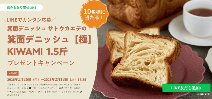 懸賞情報発酵バターが香るフラッグシップデニッシュが当たるLINEキャンペーン 懸賞名:箕面デニッシュ サトウカエデの「箕面デニッシュ【極】KIWAMI ■1.5斤」プレゼントキャンペーン当選賞品:箕面デニッシュ【極】当選人数:10名様応募条件:LINEアカウントで応募企業名:旅色 この懸賞に応募する2026年02月18日 17時59分(残り7日) 見逃せない懸賞PayPayポイント 1,000円分 / ビッグクッション10,000名様 / 100名様カレ・ド・ショコラ <スペリオリテ>毎月900名様月刊ポピーの無料おためし見本応募者全員Amazonギフトカード 最大10,000円分毎月1,000名様サントリー DHA&EPA+セサミンEX1万名様しまじろうグッズ / JCBギフトカード 1,000円分合計200名様 / 400名様 応募可能な懸賞関連する当選報告 無料でパンパース オムツが当たる会員限定キャンペーン!毎月抽選【マツキヨココカラ】マッサージ家電やポイントなどが当たるクローズドキャンペーンWEB:2026年03月15日 / ハガキ:2026年03月22日TOMORROW X TOGETHERのコンサートチケットも当たる豪華キャンペーン2026年03月31日(賞品によって異なります)ANA国内線往復航空券がその場で当たる豪華LINEキャンペーン締切日不明JCBギフトカード5,000円分が1,000名様に当たる大量当選ハガキ懸賞残り18日6,000名様にえらべるPayが当たるサンスターの歯科検診応援キャンペーン2026年12月31日(全6回開催) 「ディズニーチケット」がマックスバリュ東海×ハウスのキャンペーンで当選しました!SUNTORY「ボスグリーン 4週間体験モニター6,000名様募集!キャンペーン」バロー×ヤマザキビスケットのハガキ懸賞で「商品券 2,000円分」が当選しました♪エースコック「CMで遊んで、現金1万円を当てよう!茹でたて名人キャンペーン」DANONのTwitter懸賞で「オイコス4個入りスペシャルBOX」が当選しました!フィールコーポレーション&宝酒造 共同企画「2015タカラウィンターフェア」 関連情報: オープン懸賞LINE懸賞ネット懸賞SNS懸賞食品・飲料懸賞情報 食品・グルメ詰め合わせ・セット HOME懸賞情報応募方法SNS懸賞LINE懸賞発酵バターが香るフラッグシップデニッシュが当たるLINEキャンペーン 2026年02月05日 更新:ものりんず@懸賞主婦【厳選】毎日応募 【全て】毎日応募 年末年始懸賞