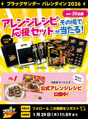 懸賞情報その場で当たるブラックサンダーのアレンジレシピ応援セットが当たるキャンペーン 懸賞名:ブラックサンダーバレンタイン2026当選賞品:アレンジレシピ応援セット当選人数:39名様応募条件:X(Twitter)アカウントで毎日その場で当たる企業名:有楽製菓 この懸賞に応募する2026年01月29日 11時59分(残り1日) 見逃せない懸賞HERA コスメサンプル1,500名様えらべるPay 最大1,000円分3,000名様コズレオリジナルデザイン「出生届」メルマガ登録して必ずもらえるJTBトラベルギフト 5万円分 / 直産ギフトカード 1万円分 / カタログギフト / えらべるPay 500円分10名様 / 50名様 / 200名様 / 1,000名様サンドラッグ専用QUOカードPay 最大1万円分1,100名様しまじろうグッズ / JCBギフトカード 1,000円分合計200名様 / 400名様 応募可能な懸賞関連する当選報告 ピジョンのベビースキンケアが無料サンプルで試せるキャンペーン締切日不明DEZERTの幕張メッセ公演チケットやサイン入りグッズが当たるカラオケDAMのキャンペーン残り26日毎月開催!JA香川県の農産物などが当たるクイズキャンペーン定期開催TinyTANデザインドリンクチケットやPayPayポイントが当たる大量当選懸賞残り32日5,000円分のオリジナルデザインQUOカードが当たるレシートキャンペーン残り3日毎月50名様にQUOカードが当たる会員限定キャンペーン♪毎月開催 サントリーのクローズド懸賞で「豪華晩酌セット」が当選しました!buzzlife「カルピスのチカラを発見(アサヒ飲料株式会社)プロジェクト」MONIPLA「ユニリーバ CLEAR モニプラキャンペーン」Yストア×おやつカンパニーのハガキ懸賞で「おやつタウン入場券」が当選しました♪ユニフルーティーのハガキ懸賞で「ソロブレンダー」が当選しました☆フィール×キューピー×オタフク×キリンの懸賞で「キューピー工場見学&お好み焼き教室」が当選しました♪ 関連情報: X懸賞(Twitter懸賞)オープン懸賞毎日応募その場で当たるネット懸賞SNS懸賞食品・飲料バレンタイン懸賞情報 記念日・特別な日詰め合わせ・セットお菓子・スイーツ・デザート HOME懸賞情報応募方法SNS懸賞X懸賞(Twitter懸賞)ブラックサンダーのアレンジレシピ応援セットが当たるキャンペーン 2026年01月23日 更新:ものりんず@懸賞主婦【厳選】毎日応募 【全て】毎日応募 年末年始懸賞