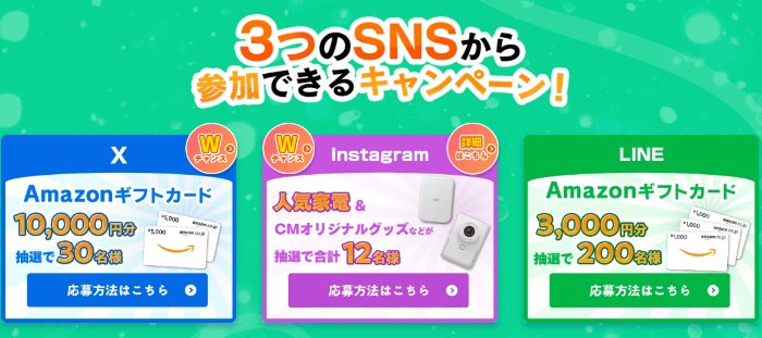 懸賞情報1万円分のAmazonギフトカードや人気家電も当たる豪華SNS懸賞 懸賞名:CM第10話公開記念 打倒シドウ!ナコに声援を!キャンペーン当選賞品&当選人数:X:Amazonギフト券 10,000円分(30名様)Instagram:キヤノンスマホ用ミニプリンター+オリジナルグッズ(10名様)LINE:Amazonギフト券 3,000円分(200名様)応募条件:X・Instagram・LINEアカウントで応募企業名:BOATRACE振興会 この懸賞に応募する2025年10月12日 18時00分(残り3日) 見逃せない懸賞-196無糖<ダブルレモン>無料引換クーポン29万名様楽天ポイント 最大10,000ポイント毎週2,500名様パンパース オムツ毎月1名様ONE BY KOSE シワ改善美容液サンプル10,000名様ハーゲンダッツ引換券10,000名様月刊ポピーの無料おためし見本応募者全員 応募可能な懸賞関連する当選報告 合計6,100名様に最大5万円分のデジタルポイントがその場で当たる豪華懸賞残り53日毎月50名様に明治 ほほえみ らくらくミルクが当たるLINEキャンペーン2025年10月17日15:00(毎月抽選)最大10,000円分のデジタルポイントが当たるフローズンアワード2025キャンペーン残り53日毎月開催♪今月のオススメ商品セットが当たるキャンペーン!毎月開催旅行券やギフトカードなどが当たる東京新聞の豪華クイズキャンペーン残り2日宿泊券や豪華食品も当たる読売新聞の定期キャンペーン!定期開催 伊藤園「NEW TEAs’TEA 第二弾先行体験セット」が当選しました♪日本ハムのハガキ懸賞で「新型PlayStation4本体」が当選しましたー☆ESSEのハガキ懸賞で「日清オイリオ 新ボトル4種セット」が当選しました☆クリムゾン クランのTwitter懸賞で「Panasonic 目もとエステ」が当選しました☆ツルハドラッグ×ユニリーバのレシート懸賞で「エアウィーヴ スマート01」が当選しました!伊藤ハムのクローズド懸賞で「伊藤ハム商品詰め合わせ」が当選しました! 関連情報: X懸賞(Twitter懸賞)オープン懸賞LINE懸賞ネット懸賞家電・デジタル機器Instagram懸賞豪華・高額懸賞現金・金券・ギフト券SNS懸賞懸賞情報 ボートレース|競艇CANON|キヤノン高額賞品・高級品Amazonギフト券商品券・ギフト券・金券スマホ・パソコンデジタル家電・AV機器 HOME懸賞情報応募方法SNS懸賞X懸賞(Twitter懸賞)1万円分のAmazonギフトカードや人気家電も当たる豪華SNS懸賞 2025年10月08日 更新:ものりんず@懸賞主婦【厳選】毎日応募 【全て】毎日応募