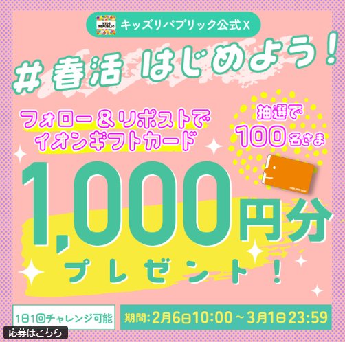 懸賞情報その場で当たるイオンギフトカード1,000円分がその場で当たる毎日応募Xキャンペーン 懸賞名:イオン春活はじめようキャンペーン当選賞品:イオンギフトカード 1,000円分当選人数:100名様応募条件:X(Twitter)アカウントで毎日その場で当たる企業名:イオン この懸賞に応募する2026年03月01日(残り21日) 見逃せない懸賞ブタメンオリジナル電気ケトル毎月100名様東京ディズニーシー 貸し切りパーティー招待 / ディズニーリゾート パークチケット4,000組8,000名様 / 1,500組3,000名様カタログギフト / Amazonギフトカード 500円分5名様 / 50名様JTBトラベルギフト 10万円分 / ビスケットセット28名様 / 2,280名様七味 2本セット各回500名様Amazonギフト券 10,000円分 / ジェラートピケ ママバッグ3名様 / 1名様 応募可能な懸賞関連する当選報告 最大16,000ディズニーポイントがもらえるオンライン新規入会キャンペーン残り51日FIFAワールドカップ2026 日本戦チケット または えらべるPayが当たる豪華懸賞残り36日豪華家電やカタログギフトなども当たる大量当選懸賞2026年03月15日(賞品によって異なります)TVアニメ「メダリスト」のコラボグッズや三幸製菓お菓子セットが当たるキャンペーン2026年02月28日(全2回開催)濃厚チョコブラウニー詰め合わせやえらべるPayが当たるブルボンのレシート懸賞残り20日オリジナルモバイルバッテリーやデジタルギフトが当たるクローズドキャンペーン2026年04月30日(全2回抽選) ヤマナカ×カゴメのハガキ懸賞で「カゴメ商品詰め合わせ」が当選しました!モニプラのキャンペーンで「製菓材料セット」が当選しました♪バロー×ヤマザキビスケットのハガキ懸賞で「商品券 2,000円分」が当選しました♪日本ハムのハガキ懸賞で「新型PlayStation4本体」が当選しましたー☆ハウス食品のTwitter懸賞で「プロクオリティ詰め合わせ」が当選しました!Amazon EchoのTwitter懸賞でAIスピーカー「Echo Spot」が当選しました♪ 関連情報: X懸賞(Twitter懸賞)オープン懸賞毎日応募その場で当たるネット懸賞現金・金券・ギフト券SNS懸賞懸賞情報 商品券・ギフト券・金券AEON|イオン HOME懸賞情報応募方法SNS懸賞X懸賞(Twitter懸賞)イオンギフトカード1,000円分がその場で当たる毎日応募Xキャンペーン 2026年02月06日 更新:ものりんず@懸賞主婦【厳選】毎日応募 【全て】毎日応募 年末年始懸賞
