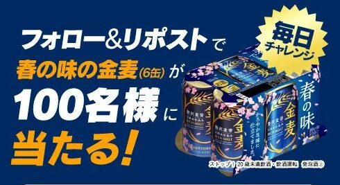 懸賞情報100名様に金麦 350ml×6缶が当たる毎日応募Xキャンペーン 懸賞名:帰れば金麦 CM公開キャンペーン当選賞品:金麦 6缶当選人数:100名様応募条件:X(Twitter)アカウントで毎日応募企業名:サントリー この懸賞に応募する(応募期間終了)2026年03月16日今すぐ応募可能な懸賞はコチラから 見逃せない懸賞ミルク商品モニター毎週400名様Yogibo Max / Dyson 空気清浄ファンヒーター / おうち呑み名人 2WAYグリル&国産黒毛和牛 他100名様 / 100名様 / 1,000名様 他Dyson コードレス掃除機 / 電動アシスト自転車 / combi ベビーカー 他1名様 / 1名様 / 1名様 他Yunth ❘ Vのオリジナルステッカー / Yunth豪華セット1,000名様 / 100名様ディズニーチケット+フードバウチャー 5,000円分 他250組500名様 他サンリオの幼児向け英語教材がお試しできる無料モニターキャンペーン 応募可能な懸賞関連する当選報告 毎月60名様にZONe ENERGY 1ケースが当たるクローズドキャンペーン2026年12月24日(毎月開催)最大1,000円分の図書カードネットギフトが当たるアプリくじキャンペーン残り6日Wチャンスもアリ!BRUNOマルチグリルポットやスーツケースなどが当たるキャンペーン残り21日ノンタン50周年記念のアクリルキーホルダーが当たるキャンペーン残り41日資生堂 PRIORのスキンケアがサンプルでお試しできるキャンペーン残り1日番組オリジナルグッズなども当たるテレビ愛知のプレゼントキャンペーン随時開催(賞品によって異なります) 「ディズニーリゾート パークチケット」がイトーヨーカドーのクローズド懸賞で当選しました!東邦液化ガスLINE懸賞で「ジェフグルメカード5,000円分」が当選しました♪DCM&フマキラーのハガキ懸賞で「園芸用品詰め合わせ」が当選しました!新日本スーパー×日清のキャンペーンで「日清どん兵衛食べ比べセット」が当選しました!湖池屋「第二回 一斗缶に入ったスナックの詰め合わせを1,000名様にプレゼント!」ケンコーマヨネーズのTwitter懸賞で「サラダボウル」が当選しました! 関連情報: X懸賞(Twitter懸賞)オープン懸賞毎日応募ネット懸賞SNS懸賞食品・飲料懸賞情報 ドリンク・飲料お酒サントリー HOME懸賞情報応募方法SNS懸賞X懸賞(Twitter懸賞)100名様に金麦 350ml×6缶が当たる毎日応募Xキャンペーン 2026年03月02日 更新:ものりんず@懸賞主婦【厳選】毎日応募 【全て】毎日応募