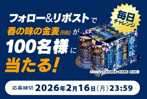 懸賞情報100名様に金麦 350ml×6缶が当たる毎日応募Xキャンペーン 懸賞名:帰れば金麦 CM公開キャンペーン当選賞品:金麦 6缶当選人数:100名様応募条件:X(Twitter)アカウントで毎日応募企業名:サントリー この懸賞に応募する2026年02月16日(残り13日) 見逃せない懸賞ハローキティぬいぐるみ / グルメカタログギフト / えらべるPay 500円相当10,000名様 / 6,000名様 / 2,000名様サウナハット+サウナマット+おいしい免疫ケア / えらべるPay 最大1,000円分1,000名様 / 19,000名様カウネット オリジナル商品毎月50名様PayPayポイント 最大100,000円相当合計30万名様ジムビームソーダ コンビニ引換クーポン30万名様ワイドパンツ / ドライ杢プリントTシャツ商品モニター6名様 / 3名様 応募可能な懸賞関連する当選報告 【定期開催】最新人気家電などが当たるエディオンのX懸賞!随時開催パナソニック リフトケア美顔器や花王商品も当たるゲームキャンペーン残り56日図書カードネットギフトが当たるアンケートキャンペーン!毎月抽選家+車のセットや総額1億円分の建築資金も当たるトヨタホーム愛知の豪華懸賞2026年02月23日(全2回抽選)毎日その場で抽選!森永製菓商品が当たる会員限定キャンペーン残り25日最新ゲーム機やデジタル家電が当たるSNS豪華懸賞!定期開催 キューピー「キューピー製品詰め合わせ」が当選しました☆フィール×はごろもフーズのハガキ懸賞で「ジャンボ海水プール招待券」が当選しました!Suntory「『スターバックス ブラックコーヒー パイクプレイス ロースト』発売記念8,000名様に当たる 発売前先行お試しキャンペーン 当選者限定Wチャンスキャンペーン」フィール×ロッテのハガキ懸賞で「ロッテお菓子詰め合わせ」が当選しました♪サントリーのハガキ懸賞で「チョコレートファウンテン」が当選しました!コノミヤ・カバヤ食品のハガキ懸賞で母の日の「鉢植えカーネーション」が当選しました♪ 関連情報: X懸賞(Twitter懸賞)オープン懸賞毎日応募ネット懸賞SNS懸賞食品・飲料懸賞情報 ドリンク・飲料お酒サントリー HOME懸賞情報応募方法SNS懸賞X懸賞(Twitter懸賞)100名様に金麦 350ml×6缶が当たる毎日応募Xキャンペーン 2026年02月03日 更新:ものりんず@懸賞主婦【厳選】毎日応募 【全て】毎日応募 年末年始懸賞