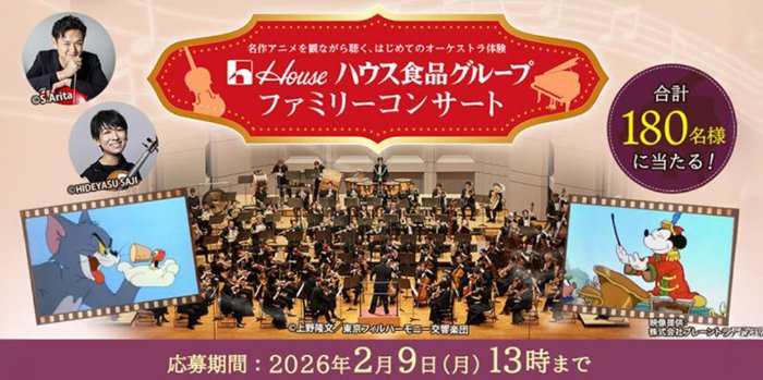 懸賞情報ハウス食品グループのファミリーコンサート チケットが当たる豪華キャンペーン 懸賞名:ファミリーコンサート チケットプレゼント当選賞品:ファミリーコンサートチケット当選人数:合計60組180名様応募条件:会員登録して応募企業名:ハウス食品グループ この懸賞に応募する2026年02月09日 13時00分(残り12日) 見逃せない懸賞Coke ONドリンクチケット / PayPayポイント 500ポイント 他100,000名様 / 10,000名様 / 50名様 他デジタルギフト 200円分10,000名様はじめてのベビースタイ応募者全員デジタルポイント 最大5万円分 / はぴだんぶいキャラクタールーム宿泊券 他各回15,070名様 / 各回5組10名様 他七味 2本セット各回500名様妊婦さん必見!無料で試せる「紙おむつ・粉ミルク」のお得情報 BEST10♪ 応募可能な懸賞関連する当選報告 アマギフやHMV&BOOKS online 限定クーポンなどが当たるローチケ購入キャンペーン残り14日毎週抽選!ぴゅあ&たっち無料サンプルセットが当たるキャンペーン毎週抽選バースデー花束が当日届く素敵なキャンペーン♪毎日0:00~10:00のみ開催カタログギフトやQUOカードPayが当たるニチバンのクローズドキャンペーン残り3日体験カタログギフトやMUGEN-KOMBUセットも当たるフジッコのクローズド懸賞残り30日スギ薬局グループ専用QUOカードPayが当たるぬりえ投稿キャンペーン残り4日 岡三食品のハガキ懸賞で「むき栗アソートセット」が当選しました日本アクセスの懸賞で「Delcy彩るおかず詰合せ」が当選しました☆「ディズニーチケット」がマックスバリュ東海×ハウスのキャンペーンで当選しました!第2広報室「株式会社はつが cocomero 無料サンプル」ナフコトミダ×はごろもフーズのハガキ懸賞で「ナガシマ ジャンボ海水プール招待券」が当選しました!佐藤食品のハガキ懸賞で「新潟県産新之助」が当選しました! 関連情報: 育児・子育て懸賞オープン懸賞ネット懸賞豪華・高額懸賞イベント・エンタメチケット・招待券遊園地・テーマパーク・イベント懸賞情報 映像・音楽特別な体験|夢の実現育児・子育て招待券・入場券・チケット会員登録ハウス食品 HOME懸賞情報応募方法ネット懸賞ハウス食品グループのファミリーコンサート チケットが当たる豪華キャンペーン 2026年01月14日 更新:ものりんず@懸賞主婦【厳選】毎日応募 【全て】毎日応募 年末年始懸賞