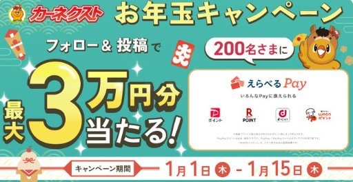 懸賞情報その場で当たる最大3万円分の えらべるPayがその場で200名様に当たるXキャンペーン 懸賞名:新春キャンペーン当選賞品:えらべるPay 最大30,000円分当選人数:200名様応募条件:X(Twitter)アカウントで毎日その場で当たる企業名:カーネクスト この懸賞に応募する2026年01月15日(残り14日) 見逃せない懸賞Coke ONドリンクチケット / 侍ジャパン オリジナル バット型タンブラー / 侍ジャパンシリーズ 観戦チケット200,000名様 / 2,000名様 / 50名様ユニバーサル・エクスプレス・パス毎日最大30組様Dyson コードレス掃除機 / 電動アシスト自転車 / combi ベビーカー 他1名様 / 1名様 / 1名様 他デジタルポイント 1,000ポイント1,000名様Amazonギフトカード 1,000円分1,000名様オリジナルフレークシール~プレママver~応募者全員 応募可能な懸賞関連する当選報告 サントリー賞品や豪華家電が当たるコツコツ懸賞♪締切日不明チョコフレークセットなどが当たる日清シスコのレシート懸賞残り32日全プレもアリ!豪華賞品が当たる白十字のサルバポイントキャンペーン残り30日2026 WORLD BASEBALL CLASSIC観戦チケットや航空券も当たる豪華懸賞残り32日えらべるPay最大10,000ポイントがその場で当たるX懸賞残り3日人気の育児グッズやテーマパークチケットなどが当たる豪華ママ・プレママさん向けキャンペーン!残り57日 Daihatsu「WAKEとドデカク出かけようキャンペーンについてのアンケート」伊藤園のTwitter懸賞で「充実野菜の3種セット」が当選しました☆サッポロビールのTwitter懸賞で「こいむぎ 1ケース」が当選しました!トラストパークのキャンペーンで「小型掃除機」が当選しました!タカオカチョコレートのTwitter懸賞で「チョコレート詰め合わせ」が当選しました♪集英社「MAQUIA ONLINE × Joma プレゼント」 関連情報: X懸賞(Twitter懸賞)オープン懸賞毎日応募その場で当たるネット懸賞豪華・高額懸賞現金・金券・ギフト券SNS懸賞懸賞情報 年末年始2025-2026高額賞品・高級品電子マネー・ポイント HOME懸賞情報応募方法SNS懸賞X懸賞(Twitter懸賞)最大3万円分の えらべるPayがその場で200名様に当たるXキャンペーン 2026年01月01日 更新:ものりんず@懸賞主婦【厳選】毎日応募 【全て】毎日応募 年末年始懸賞