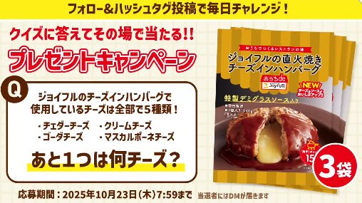 懸賞情報その場で当たるジョイフルのチーズインハンバーグが20名様にその場で当たるXキャンペーン 懸賞名:フォロー&リポストキャンペーン当選賞品:チーズインハンバーグ当選人数:20名様応募条件:X(Twitter)アカウントで毎日その場で当たる企業名:ジョイフル この懸賞に応募する2025年10月23日 07時59分(残り8日) 見逃せない懸賞えらべるPay 最大1,200円分3,850名様ハウステンボス 1DAYパスポート付き オフィシャルホテル宿泊券 他16組32名様 他入園無料招待券、グルメなど賞品によって異なりますダヴ クリーミースクラブ無料引換券2,000名様リル仕切り鍋&ホットプレート / ミニラーメンどんぶり / 秋冬メニュー詰め合わせ100名様 / 700名様 / 1,200名様デジタルギフト 最大5,000円分合計12名様 応募可能な懸賞関連する当選報告 毎月15名様にJAタウンのオススメ商品が当たるメルマガ会員限定キャンペーン毎月末日ユニークでクスっと笑える雑貨などが当たるクローズドキャンペーン2025年11月09日(全2回開催)ドライヤーやヒツジのいらない枕が当たる豪華プレゼントキャンペーン残り17日三浦桃香プロとのハーフプレー招待やメルセデス・ベンツコレクションのゴルフグッズが当たる豪華懸賞残り5日オリジナルQUOカードが当たる講談社の会員限定キャンペーン残り1日【ヤマザワ×プリマハム】東京ディズニーランド ザ・ダイヤモンドホースシュー 貸切ご招待残り81日 過去最高額「100万円分のAmazonギフト券」がIG証券の懸賞で当選!!MaManabi「ジョンソンベビー『我が家のバス育』フォト&シェアコンテスト第1期」バローグループ & サントリーグループ共同企画「バローグループ商品券3,000円分プレゼント!!キャンペーン」ヤマナカ×カゴメのハガキ懸賞で「カゴメ商品詰め合わせ」が当選しました!レックのキャンペーンで「ボリューム満点焼肉セット」が当選しました☆Suntory×バローのハガキ懸賞で「宇都宮餃子3種セット」が当選しました♪ 関連情報: X懸賞(Twitter懸賞)オープン懸賞毎日応募ネット懸賞その場で当たるSNS懸賞食品・飲料懸賞情報 食品・グルメ HOME懸賞情報応募方法SNS懸賞X懸賞(Twitter懸賞)ジョイフルのチーズインハンバーグが20名様にその場で当たるXキャンペーン 2025年10月14日 更新:ものりんず@懸賞主婦【厳選】毎日応募 【全て】毎日応募
