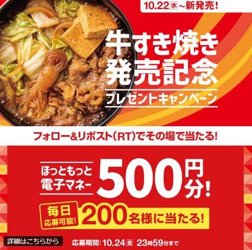 懸賞情報その場で当たるほっともっとの電子マネーが200名様に当たる毎日応募Xキャンペーン 懸賞名:焼鳥つくね重発売記念キャンペーン当選賞品:ほっともっと電子マネー 500円分当選人数:200名様応募条件:X(Twitter)アカウントで毎日その場で当たる企業名:ほっともっと この懸賞に応募する(応募期間終了)2025年10月24日今すぐ応募可能な懸賞はコチラから 見逃せない懸賞USJ ハロウィーン初日貸切招待券 / スタジオ・パス4,750組12,000名様 / 1,000組2,000名様JTBトラベルギフト 10万円分 / ビスケット詰め合わせ28名様 / 2,280名様コスメ、美容グッズモニター・サンプルなど賞品によって異なるPanasonic 電気圧力鍋 / Aladdin グラファイトトースター / BRUNO デイリーケトル 他50名様 / 50名様 / 50名様 他えらべるPay 300円分3,000名様デジタルギフト 最大5,000円分合計12名様 応募可能な懸賞関連する当選報告 サントリー セサミンEXが無料でモニターできる☆不定期開催お好きなことりっぷや旅行券がもらえる写真投稿コンテスト!随時開催EJOICAセレクトギフトがその場で当たる、バンダイの商品アンケートキャンペーン!毎月開催毎月開催♪でん六商品が当たるキャンペーン!定期開催3,000円分のQUOカードPayが当たるクイズキャンペーン!毎週金曜日開催【ライフコーポレーション首都圏×プリマハム】東京ディズニーランド ザ・ダイヤモンドホースシュー 貸切ご招待残り37日 SAPPORO「ホワイトベルグ12本」が当選しました☆ミューズ「キッチンミューズ 本体」が当選しました♪BLONETで「大人のルドゥーブル」商品モニターに当選しました!TULLY’S COFFEE「タリーズカード1,000円分」が当選しました☆伊藤園のキャンペーンで「お~いお茶に合う特選米」が当選しました!ツルハ×P&Gのクローズド懸賞で「P&G商品セット」が当選しました! 関連情報: X懸賞(Twitter懸賞)オープン懸賞毎日応募ネット懸賞その場で当たる現金・金券・ギフト券SNS懸賞懸賞情報 電子マネー・ポイント HOME懸賞情報応募方法SNS懸賞X懸賞(Twitter懸賞)ほっともっとの電子マネーが200名様に当たる毎日応募Xキャンペーン 2025年10月17日 更新:ものりんず@懸賞主婦【厳選】毎日応募 【全て】毎日応募 クリスマス懸賞 年末年始懸賞