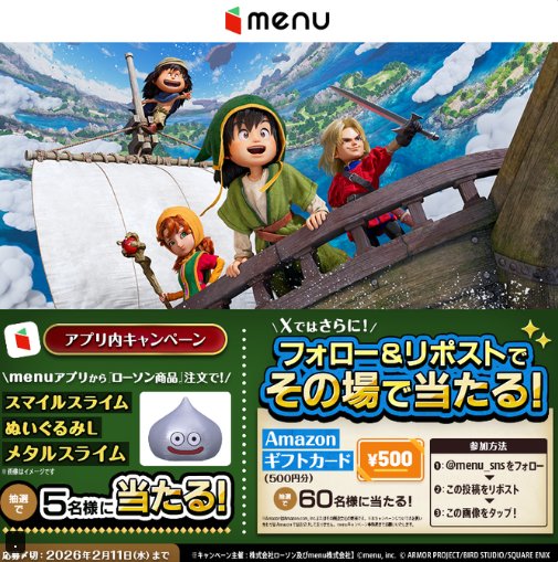 懸賞情報その場で当たるAmazonギフトカード500円分が60名様にその場で当たるXキャンペーン 懸賞名:menu飯 プレゼントキャンペーン当選賞品:Amazonギフトカード 500円分当選人数:60名様応募条件:X(Twitter)アカウントで毎日その場で当たる企業名:menu この懸賞に応募する2026年02月11日(残り10日) 見逃せない懸賞クスリのアオキギフトカード 3万円分 / スヌーピーグッズ300名様 / 合計7,000名様ピノ オリジナルグッズ賞品によって異なります無料で試せる「ベビー用スキンケア」のお得情報♪Yogibo Max / Dyson 空気清浄ファンヒーター / おうち呑み名人 2WAYグリル&国産黒毛和牛 他100名様 / 100名様 / 1,000名様 他体験カタログギフト / 八代目儀兵衛「一粒万倍米」 / MUGEN-KOMBU / ハンドタオル152名様 / 500名様 / 500名様 / 300名様母子手帳ケース / しかけ絵本 / Amazonギフト券 5,000円分 他応募者全員 / 応募者全員 / 毎月10名様 他 応募可能な懸賞関連する当選報告 総額5億円分の購入支援金が当たる、日産の豪華キャンペーン残り1日3,000円分のAmazonギフトカードがその場で当たるキャンペーン残り1日ニトリ商品券4,000円分が50名様に当たる毎日応募Xキャンペーン残り12日便利家電やポップアップテントなども当たる豪華キャンペーン!毎月末日【ツルハグループ×サンスター】しまじろうグッズが当たるクローズドキャンペーン残り6日スマートボディメジャーがお試しできるママノワのモニター懸賞残り7日 サントリーのクローズド懸賞で「豪華晩酌セット」が当選しました!新潟のつかいかたのTwitter懸賞で「ハッピーターン1年分」が当選しました!S&B「スパイス詰め合わせセット」が当選しました!丸美屋のハガキ懸賞で「丸美屋商品詰め合わせ」が当選しました☆コーナン×P&Gのハガキ懸賞で「P&G商品 3,000円相当」が当選しました♪Products Store「メンズシャツ」が当選しました! 関連情報: X懸賞(Twitter懸賞)オープン懸賞毎日応募その場で当たるネット懸賞現金・金券・ギフト券SNS懸賞懸賞情報 Amazonギフト券商品券・ギフト券・金券 HOME懸賞情報応募方法SNS懸賞X懸賞(Twitter懸賞)Amazonギフトカード500円分が60名様にその場で当たるXキャンペーン 2026年01月29日 更新:ものりんず@懸賞主婦【厳選】毎日応募 【全て】毎日応募 年末年始懸賞