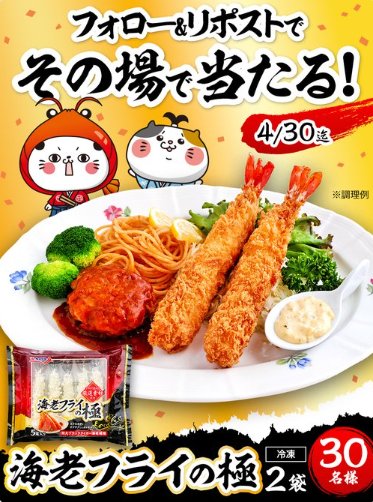 懸賞情報その場で当たる 海老フライの極が30名様にその場で当たるXキャンペーン 懸賞名:フォロー&RPキャンペーン当選賞品:海老フライの極当選人数:30名様応募条件:X(Twitter)アカウントで毎日その場で当たる企業名:極洋 この懸賞に応募する2026年04月30日(残り29日) 見逃せない懸賞 未来のレモンサワー 濃いめ1,000名様スターバックスeGift 最大10,000円分8,010名様母子手帳ケース / しかけ絵本 / Amazonギフト券 5,000円分 他応募者全員 / 応募者全員 / 毎月10名様 他スノーギア、リフト券など合計1,260名様ジョーシン専用QUOカードPay 500円分1,000名様コズレオリジナルデザイン「出生届」メルマガ登録して必ずもらえる 応募可能な懸賞 関連する当選報告 アンパンマンのムビチケやおもちゃが当たるフードリエのクローズド懸賞残り70日毎月開催!スノーギアやリフト券などが当たる豪華プレゼントキャンペーン2026年04月30日(毎月開催)スキナベーブの沐浴&保湿サンプルセットがもらえるキャンペーン締切日不明サントリー セサミンEXが無料でモニターできるお得なキャンペーン不定期開催いわての乳製品セットやオリジナルQUOカードなどが当たるJA全農いわてのクローズド懸賞残り37日1,000名様にえらべるPay最大1万円分が当たるXキャンペーン残り4日 DANONE「ダノンキッズシリーズ製品」が当選しました☆アピタ・ピアゴ&理研のハガキ懸賞で「商品券 2,000円分」が当選しました♪伊藤園「野菜で実感!毎日の健康応援キャンペーン」ライオンのキャンペーンで「iTunesコード500円分」が当選しました!buzzLife「キリンビール 新淡麗極上〈生〉を初生産品で体験プロジェクト」小野万のレシート懸賞で「塩辛セット」が当選しました! 関連情報: X懸賞(Twitter懸賞)オープン懸賞毎日応募ネット懸賞その場で当たるSNS懸賞食品・飲料懸賞情報 食品・グルメ HOME懸賞情報応募方法SNS懸賞X懸賞(Twitter懸賞)海老フライの極が30名様にその場で当たるXキャンペーン 2026年04月01日 更新:ものりんず@懸賞主婦 【厳選】毎日応募 【全て】毎日応募