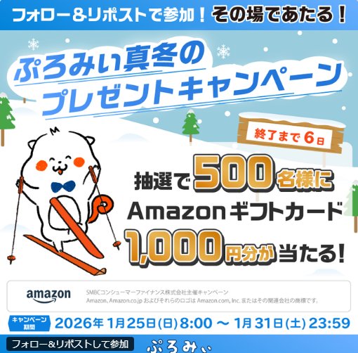 懸賞情報その場で当たるAmazonギフトカード1,000円分が500名様に当たるX懸賞 懸賞名:プレゼントキャンペーン当選賞品:Amazonギフトカード 1,000円分当選人数:500名様応募条件:X(Twitter)アカウントで毎日その場で当たる企業名:プロミス この懸賞に応募する(応募期間終了)2026年01月31日今すぐ応募可能な懸賞はコチラから 見逃せない懸賞シートマスク商品モニター1,000名様8×4デオドラントパテ無料サンプル対象者全員入園無料招待券、グルメなど賞品によって異なりますデジタルKFCカード 1,000円分7,000名様サントリー生ビール 3缶セット1,000名様コズレオリジナルデザイン「出生届」メルマガ登録して必ずもらえる 応募可能な懸賞関連する当選報告 1万名様にえらべるPay500ポイントが当たるPascoのLINEキャンペーン残り81日Nintendo Switchやルンバロボット掃除機も当たる豪華クローズドキャンペーン残り66日その場でdポイントが当たる毎日くじキャンペーン♪締切日不明アスタリフトのファンデ無料サンプルセットが全員お試しできる♪締切日不明100名様に金麦 350ml×6缶が当たる毎日応募Xキャンペーン残り8日500名様にAmazonギフト券500円分が当たるXキャンペーン残り3日 P&Gのハガキ懸賞で「ダスキン おそうじギフトカード 10,000円分」が当選しました!KIRIN「いくぜ8月!!日がわり夏のキリン祭り」KIRINのTwitter懸賞で「午後の紅茶 おいしい無糖 1ケース」が当選しました!SURF&SNOW「2017モデルのスノーボードゴーグル」が当選しました♪大塚製薬「ポカリスエット ゼリー6個」が当選しました!島耕作 × グリコ「濃厚な日々に乾杯キャンペーン」 関連情報: X懸賞(Twitter懸賞)オープン懸賞毎日応募その場で当たるネット懸賞現金・金券・ギフト券SNS懸賞懸賞情報 Amazonギフト券商品券・ギフト券・金券 HOME懸賞情報応募方法SNS懸賞X懸賞(Twitter懸賞)Amazonギフトカード1,000円分が500名様に当たるX懸賞 2026年01月26日 更新:ものりんず@懸賞主婦【厳選】毎日応募 【全て】毎日応募 年末年始懸賞