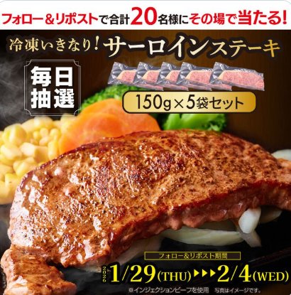懸賞情報その場で当たるサーロインステーキが20名様にその場で当たる豪華Xキャンペーン 懸賞名:毎日抽選!その場で当たる!!当選賞品:サーロインステーキ当選人数:20名様応募条件:X(Twitter)アカウントで毎日その場で当たる企業名:いきなり!ステーキ この懸賞に応募する(応募期間終了)2026年02月04日今すぐ応募可能な懸賞はコチラから 見逃せない懸賞PayPayポイント 2,000円分1,000名様最大5万ポイント1,240名様オリジナルフレークシール~プレママver~応募者全員北海道産とうもろこし+トートバッグ / シスコーン詰め合わせ+トートバッグ100名様 / 1,000名様サッポロビール対象商品無料引換券 / 50円引きクーポン3,000名様気になっていたあの商品をお得に試せるサイト「サンプル百貨店」 応募可能な懸賞関連する当選報告 【定期開催】最新人気家電などが当たるエディオンのX懸賞!随時開催【定期開催】美容コスメが当たる!ヨドバシカメラのX懸賞随時開催アサヒのドリンクセットなどが当たるAsahi Parkキャンペーン☆締切日不明全国のご当地乾麺が200名様に当たるプレゼントキャンペーン残り18日図書カードネットギフトが当たるアンケートキャンペーン!毎月抽選【対象店舗×サントリー】USJ 1デイ・スタジオ・パスが当たる豪華レシート懸賞残り18日 キンレイのキャンペーンで「お水がいらない ラーメン北魁4食セット」が当選しました♪「クリスマスケーキ」が平和堂×ダノンのハガキ懸賞で当選しました☆ウエルシア×大塚製薬のキャンペーンで「ボディメンテ1ケース」が当選しました!不二家のTwitter懸賞で「ご当地カントリーマアム」が当選しました!Travel.jp「タビーノ&メグリーノ」が当選しました♪MONIPLA「ユニリーバ CLEAR モニプラキャンペーン」 関連情報: X懸賞(Twitter懸賞)オープン懸賞毎日応募その場で当たるネット懸賞SNS懸賞食品・飲料懸賞情報 食品・グルメお肉・ステーキ HOME懸賞情報応募方法SNS懸賞X懸賞(Twitter懸賞)サーロインステーキが20名様にその場で当たる豪華Xキャンペーン 2026年01月29日 更新:ものりんず@懸賞主婦【厳選】毎日応募 【全て】毎日応募