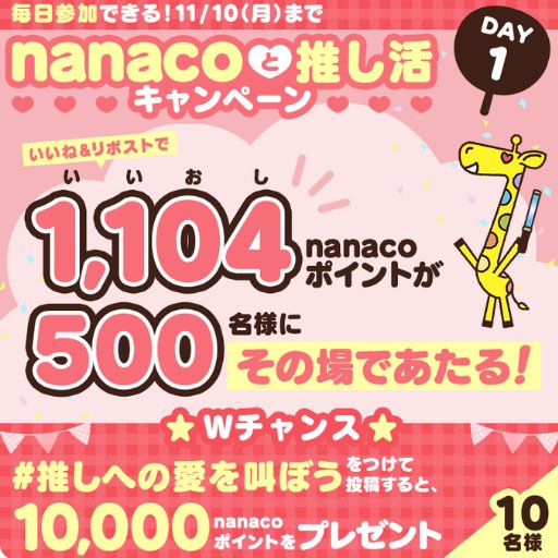 懸賞情報その場で当たる1,104円分のnanacoポイントがその場で当たるXキャンペーン 懸賞名:nanacoと推し活キャンペーン当選賞品:nanacoポイント 1,104円分当選人数:500名様応募条件:X(Twitter)アカウントで毎日その場で当たる企業名:電子マネー nanaco この懸賞に応募する2025年11月10日(残り5日) 見逃せない懸賞サントリー セサミンEX 商品モニター1万名様体組成計 / クッキングスケール / マルコメ君歩数計 / PayPayポイント 500ポイント20名様 / 30名様 / 50名様 / 1,000名様デジタルギフト 最大5,000円分合計12名様コンビニ無料クーポン 他合計3,000本 他バルミューダ製品 / えらべるPay 500円分毎月5名様 / 毎月1,500名様AirPods Pro / ソーダストリーム / 40V型液晶テレビ / Princess テーブルグリル1名様 / 1名様 / 1名様 / 1名様 応募可能な懸賞関連する当選報告 【開催企業×サントリー】最大10,000円分のデジタルポイントが当たる大量当選懸賞残り29日東京中央区内の企業商品が当たる「中央区ブランド」懸賞♪残り14日Wチャンスもアリ!国産ブランド牛肉が当たる豪華ハガキ懸賞残り16日毎月開催♪ジョンソン製品が当たるアンケートキャンペーン定期開催宿泊券やコスメ・日用品が当たるキャンペーン☆定期開催毎週100名様に和光堂の離乳食が当たるLINEキャンペーン締切日不明(毎週抽選) SuntoryのTwitter懸賞で「頂<極上 ZERO>1ケース」が当選しました♪ママこえ「コンビニスイーツに関するアンケートの当選謝礼」babycoのキャンペーンで「あかちゃんの育脳クラシックえほん」が当選しました♪しんきん「グルメギフト 『旬彩カタログ しんきんのつなぐ力』絆コース」が当選しました!マックスバリュ東海×森永製菓のハガキ懸賞で「木下大サーカス招待チケット」が当選しました♪エースコック「CMで遊んで、現金1万円を当てよう!茹でたて名人キャンペーン」 関連情報: X懸賞(Twitter懸賞)オープン懸賞毎日応募ネット懸賞その場で当たる現金・金券・ギフト券SNS懸賞懸賞情報 電子マネー・ポイント HOME懸賞情報応募方法SNS懸賞X懸賞(Twitter懸賞)1,104円分のnanacoポイントがその場で当たるXキャンペーン 2025年11月05日 更新:ものりんず@懸賞主婦【厳選】毎日応募 【全て】毎日応募