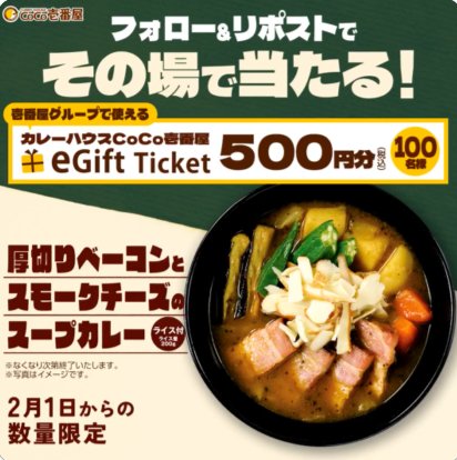 懸賞情報その場で当たるココイチeギフト500円分がその場で当たる毎日応募Xキャンペーン 懸賞名:eギフト導入記念キャンペーン当選賞品:ココイチeギフト 500円分当選人数:100名様応募条件:X(Twitter)アカウントで毎日その場で当たる企業名:カレーハウスCoCo壱番屋 この懸賞に応募する締切日不明 見逃せない懸賞えらべるPay 最大5,000円相当不明ジッパーバッグ / キーホルダー / QUOカード 500円分1,000名様 / 300名様 / 200名様カウネット オリジナル商品毎月50名様スノーギア、リフト券など合計1,260名様ジムビームソーダ コンビニ引換クーポン30万名様こどもちゃれんじ資料&年齢別体験セット応募者全員 応募可能な懸賞関連する当選報告 キユーピー商品の詰め合わせがその場で当たるミッションキャンペーン残り10日毎月開催☆オリジナルグッズや生活雑貨が当たる会員限定キャンペーン毎月末日JALビジネスクラスで行く「ハワイ旅行」などが当たる豪華懸賞残り49日Amazonギフトカードが当たるEPARKのLINEプレゼントキャンペーンEPARK公式LINE友だち数100万人到達までご当地グルメやとっておきの逸品を無料でお試しできるモニターキャンペーン!随時開催【サッポロビール×イオンビッグ】サッポロ生ビール黒ラベルが当たるクローズドキャンペーン残り25日 カゴメ「ちいさなももこの苗」が当選しました♪パールライス「無洗米 あいちのかおり 5kg」が当選しました♪KIRIN「キリン メッツ オリジナルQUOカード」が当選しました♪バロー×雪印メグミルクのハガキ懸賞で「コードレス電動ブラシ」が当選しました!「クリスマスケーキ」が平和堂×ダノンのハガキ懸賞で当選しました☆日本ハム「森の薫り 詰め合わせ」が当選しました♪ 関連情報: X懸賞(Twitter懸賞)オープン懸賞毎日応募その場で当たるネット懸賞現金・金券・ギフト券SNS懸賞懸賞情報 ギフトコード|デジタルギフト食事券・グルメ券ココイチ|CoCo壱番屋 HOME懸賞情報応募方法SNS懸賞X懸賞(Twitter懸賞)ココイチeギフト500円分がその場で当たる毎日応募Xキャンペーン 2026年02月09日 更新:ものりんず@懸賞主婦【厳選】毎日応募 【全て】毎日応募 年末年始懸賞