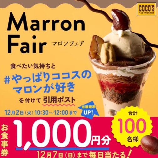 懸賞情報ココス食事券1,000円分が当たる毎日応募Xキャンペーン 懸賞名:フォロー&リプライキャンペーン当選賞品:ココス食事券 1,000円分当選人数:100名様応募条件:X(Twitter)アカウントで毎日応募企業名:ココス この懸賞に応募する(応募期間終了)2025年12月07日今すぐ応募可能な懸賞はコチラから 見逃せない懸賞侍ジャパンシリーズ 観戦チケット / バット型タンブラー / Coke ON ドリンクチケット50名様 / 2,000名様 / 200,000名様えらべるPay 1,000円分各回1,000名様パンパース オムツ毎月1名様えらべるPay 500ポイント1,000名様レストランGranna食事券 / PayPayポイント 10,000円分 / 中村屋お菓子詰め合わせ 他各回10組20名様 / 各回10名様 / 各回15名様 他Dyson コードレス掃除機 / 電動アシスト自転車 / combi ベビーカー 他1名様 / 1名様 / 1名様 他 応募可能な懸賞関連する当選報告 最新ゲーム機やデジタル家電が当たるSNS豪華懸賞!定期開催6,000名様にえらべるPayが当たる歯科検診応援キャンペーン2025年12月31日(全6回開催)石川県のブランド牛能登牛や石川県産の美味しい味覚セットも当たる豪華懸賞2025年12月31日(全2回開催)ジャパネットクーポン3万円分が当たる動画投稿キャンペーン残り10日【対象チェーン×亀田製菓】最大5万円分のえらべるPay or ギフトカードが当たるキャンペーン残り21日毎月開催!ワコール製品が当たるメンバー限定キャンペーン残り4日 glico「ハッピーキャッチャーキャンペーン」レバンガ北海道のX懸賞で「ドリームヒル よくばりフレーバーセット」が当選しました!コノミヤのクローズド懸賞で「酒類詰め合わせ」が当選しました!丸美屋の懸賞で「丸美屋商品詰め合わせ」が当選しました!KOSE「アスタブランのサンプルセット」が当選しました☆9社主催のハガキ懸賞で「家庭用品詰め合わせ」が当選しました♪ 関連情報: X懸賞(Twitter懸賞)オープン懸賞毎日応募ネット懸賞現金・金券・ギフト券SNS懸賞懸賞情報 食事券・グルメ券 HOME懸賞情報応募方法SNS懸賞X懸賞(Twitter懸賞)ココス食事券1,000円分が当たる毎日応募Xキャンペーン 2025年12月02日 更新:ものりんず@懸賞主婦【厳選】毎日応募 【全て】毎日応募 クリスマス懸賞 年末年始懸賞
