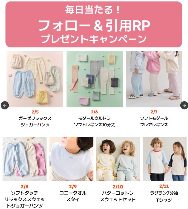 懸賞情報コニーのキッズ、ベビーアイテムが当たる毎日応募Xキャンペーン 懸賞名:プレゼントキャンペーン当選賞品:キッズ、ベビーアイテム(日替わり)当選人数:毎日1名様応募条件:X(Twitter)アカウントで毎日応募企業名:コニー この懸賞に応募する2026年02月11日(残り3日) 見逃せない懸賞リポビタンファイン 10本セット50名様大人気アイテムや豪華体験 / ツルハポイント or WAON POINT 1,000ポイント1,100名様 / 5,000名様JTBトラベルギフト 35,000円分毎月35名様QUOカードPay 最大3,000円分1,450名様TinyTANデザインドリンクチケット / PayPayポイント 1,000ポイント50,000名様 / 1,000名様マタニティ・ベビー用品・コスメなどのサンプルセット賞品によって異なる 応募可能な懸賞関連する当選報告 毎月開催!豪華グルメなどが当たる「片付け110番」のLINEキャンペーン毎月11日~Wチャンスもアリ!10,000WAON POINTが当たる投票キャンペーン(本日最終日!!)2026年春季新商品&リニューアル商品がその場で当たる会員限定キャンペーン残り22日10万円分の星野リゾート宿泊ギフトが当たる豪華クイズキャンペーン2026年02月28日(全3回開催)3,000円分のディズニーギフトカードが当たる豪華アプリ懸賞残り20日全プレ☆スキンチェックでオルビス無料サンプルがもらえるキャンペーン!常時開催中 メーカー各社主催のハガキ懸賞で「家庭用品詰め合わせ」が当選しました☆パイロットコーポレーションのTwitter懸賞で「名入れボールペン」が当選しました!プリマハムのハガキ懸賞で「鹿児島県産黒毛和牛サーロインステーキ」が当選しました☆Aprica「ブレスエアー クッション」が当選しました!東芝のキャンペーンで「新鮮フルーツセット」が当選しました♪ヤマサ醤油「第30回 YAMASA クッキング BINGO」 関連情報: X懸賞(Twitter懸賞)育児・子育て懸賞オープン懸賞毎日応募ネット懸賞SNS懸賞ベビー・キッズ・おもちゃ懸賞情報 赤ちゃん・育児用品育児・子育て HOME懸賞情報応募方法SNS懸賞X懸賞(Twitter懸賞)コニーのキッズ、ベビーアイテムが当たる毎日応募Xキャンペーン 2026年02月05日 更新:ものりんず@懸賞主婦【厳選】毎日応募 【全て】毎日応募 年末年始懸賞