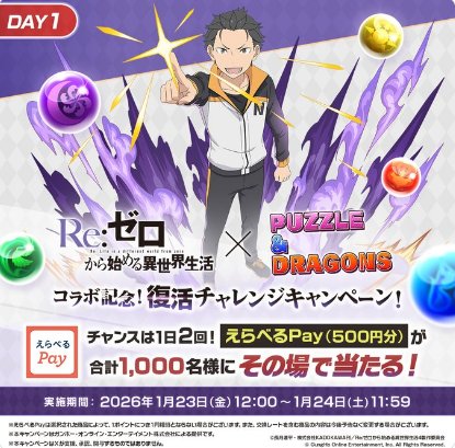 懸賞情報その場で当たる1,000名様にその場でえらべるPayが当たるXキャンペーン 懸賞名:『Re:ゼロから始める異世界生活』×『パズドラ』コラボ記念!復活チャレンジキャンペーン!当選賞品:えらべるPay 500円分当選人数:1,000名様応募条件:X(Twitter)アカウントで毎日その場で当たる企業名:パズル&ドラゴンズ この懸賞に応募する(応募期間終了)2026年01月27日 11時59分今すぐ応募可能な懸賞はコチラから 見逃せない懸賞JTBトラベルギフト 5万円分 / ハンディクリーナー / カタログギフト 他各回5名様 / 各回20名様 / 各回30名様 他JCBギフトカード 3,000円分 / クッション / CIAO缶シリーズ 1ケース1,000名様 / 応募券を集めて必ずもらえる / 応募券を集めて必ずもらえるオルビス無料サンプルセット応募者全員JTBトラベルギフト 最大10万円分 / ドライブレコーダー / カタログギフト 他8名様 / 3名様 / 合計14名様 他紅茶花伝が1本無料になるCoke ONドリンクチケット1万名様コズレオリジナルデザイン「出生届」メルマガ登録して必ずもらえる 応募可能な懸賞関連する当選報告 毎月開催!沢の鶴製品が当たるクイズキャンペーン毎月開催大阪名物「満月ポン」が毎月当たるプレゼントキャンペーン♪毎月開催全プレもアリ!えらべるPayが当たるグリコのジャイアントコーン購入キャンペーン2026年03月08日(賞品によって異なります)Wチャンスもアリ!フライパンセットやクッションなども丸美屋の大量当選懸賞2026年05月09日(毎週抽選もあり)毎月100名様に鶏すき焼きお楽しみセットが当たるクイズキャンペーン2026年04月30日(毎月抽選)グルメや図書カードネットギフトなども当たる書籍購入キャンペーン残り9日 マックスバリュ東海×伊藤ハムのハガキ懸賞で「伝承ギフトセット」が当選しました!ブルボンのTwitter懸賞で「濃厚チョコブラウニーピスタチオ&ピスタチオラッシュ」が当選しました♪念願の家電当選「冷凍庫」がイオンのクローズドキャンペーンで当選しました!日本アクセスの懸賞で「どら焼き」が当選しました♪イトーヨーカ堂・AGFのハガキ懸賞で「プチ・ラムカン・ダムール・セット」が当選しました♪フィール×ニッポンハムのハガキ懸賞で「セ・パ交流戦チケット」が当選しました☆ 関連情報: X懸賞(Twitter懸賞)オープン懸賞毎日応募ネット懸賞その場で当たる現金・金券・ギフト券大量当選SNS懸賞懸賞情報 電子マネー・ポイント HOME懸賞情報応募方法SNS懸賞X懸賞(Twitter懸賞)1,000名様にその場でえらべるPayが当たるXキャンペーン 2026年01月23日 更新:ものりんず@懸賞主婦【厳選】毎日応募 【全て】毎日応募